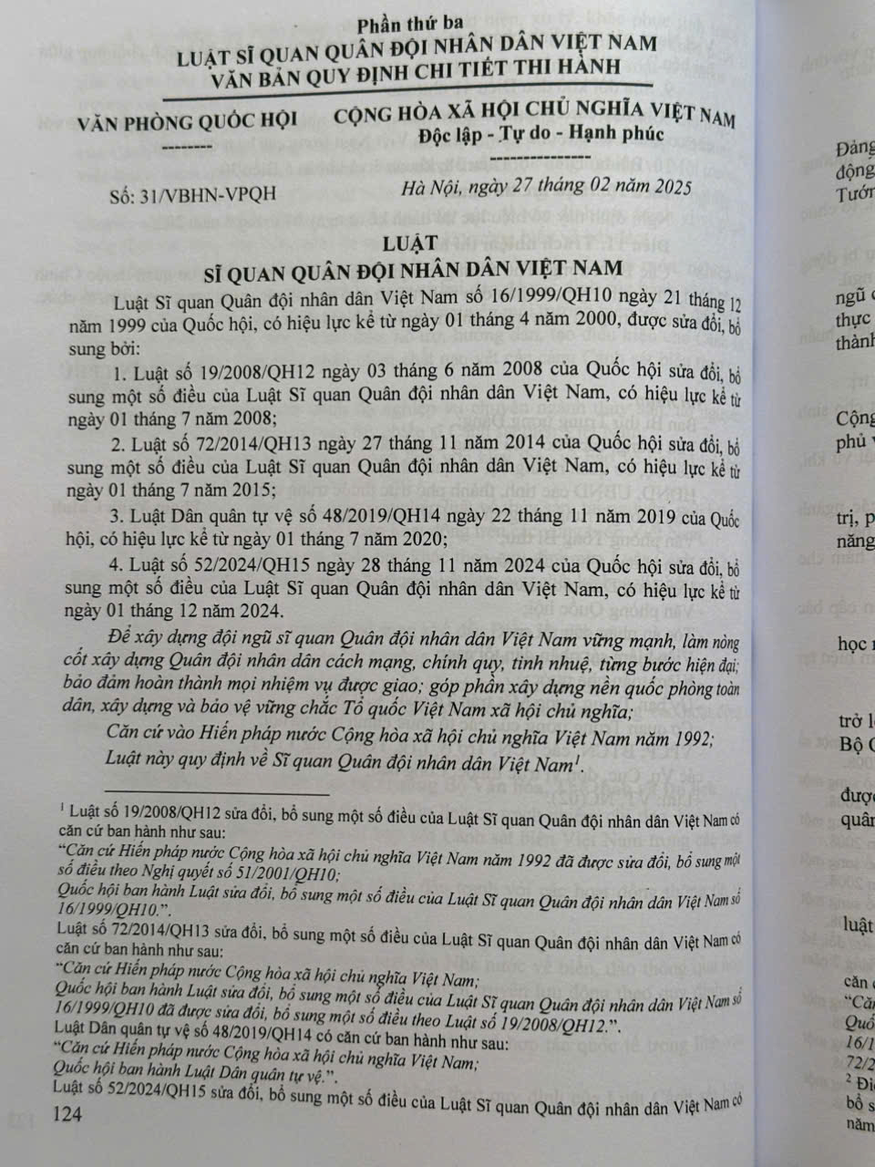 Luật Sĩ quan quân đội nhân dân Việt Nam năm 1999 (sửa  đổi, bổ sung năm 2008, 2014, 2019, 2024)  Luật Tố tụng hành chính năm 2015 (sửa đổi, bổ sung năm 2019, 2024, 2025)