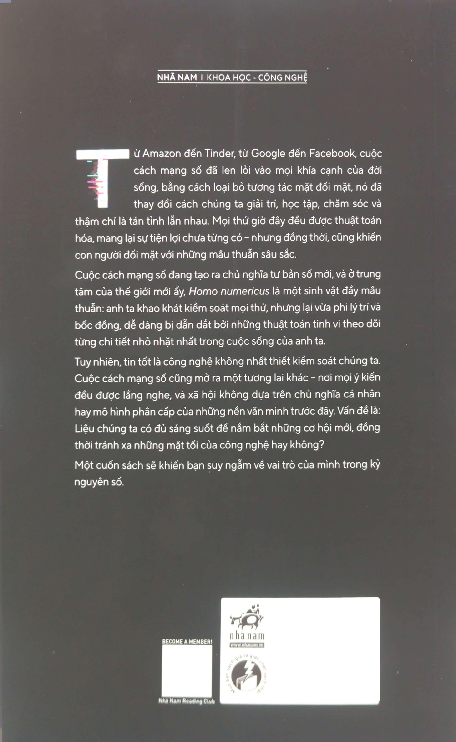 Cuộc cách mạng số đang tạo ra chủ nghĩa tư bản số mới, và ở trung tâm của thế giới mới ấy, Homo numericus là một sinh vật đầy mâu thuẫn: anh ta khao khát kiểm soát mọi thứ, nhưng lại vừa phi lý trí và bốc đồng, dễ dàng bị dẫn dắt bởi những thuật toán tinh vi theo dõi từng chi tiết nhỏ nhặt nhất trong cuộc sống của anh ta.