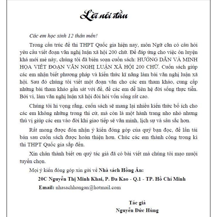Mua tại TiktokSách - Hướng dẫn và minh họa viết đoạn văn nghị luận xã hội 200 chữ (dùng chung cho các bộ sgk hiện hành) - HA Các em học sinh 12 thân mến! Trong cấu trúc đề thi THPT Quốc gia hiện nay, môn Ngữ căn có câu hỏi yêu cầu viết đoạn văn nghị luận xã hội 200 chữ. Để đáp ứng cho việc ôn luyện khá mới mẻ này, chúng tôi đã biên soạn cuốn sách: HƯỚNG DẪN VÀ MINH HỌA VIẾT ĐOẠN VĂN NGHỊ LUẬN XÃ HỘI 200 CHỮ. Cuốn sách giúp các em nhận biết phương pháp và kiến thức kĩ năng làm bài văn nghị luận xã hội. Sau đó chúng tôi viết một đoạn văn cho các em tham khảo, cung cấp những bài tham khảo gần sát với đề, để các em dễ liên hệ đời sống thực tiễn. Bởi vì, làm văn nghị luận xã hội đòi hỏi vốn sống rất cao. Chúng tôi hi vọng rằng, cuốn sách sẽ mang lại nhiều kiến thức bổ ích cho các em không những trong thi cử, mà còn là một hành trang nho nhỏ nhưng thú vị giúp các em vào đời khi giao tiếp sẽ văn minh, lịch sự và sâu sắc hơn. Rất mong được đón nhận ý kiến đóng góp của quý bạn đọc, để lần tái bản sau cuốn sách được hoàn thiện hơn. Chúc các em thành công trong kì thi THPT Quốc gia sắp đến. Xin chân thành biết ơn quý tác giả đã có bài viết mà chúng tôi mạo muội tuyển chọn.