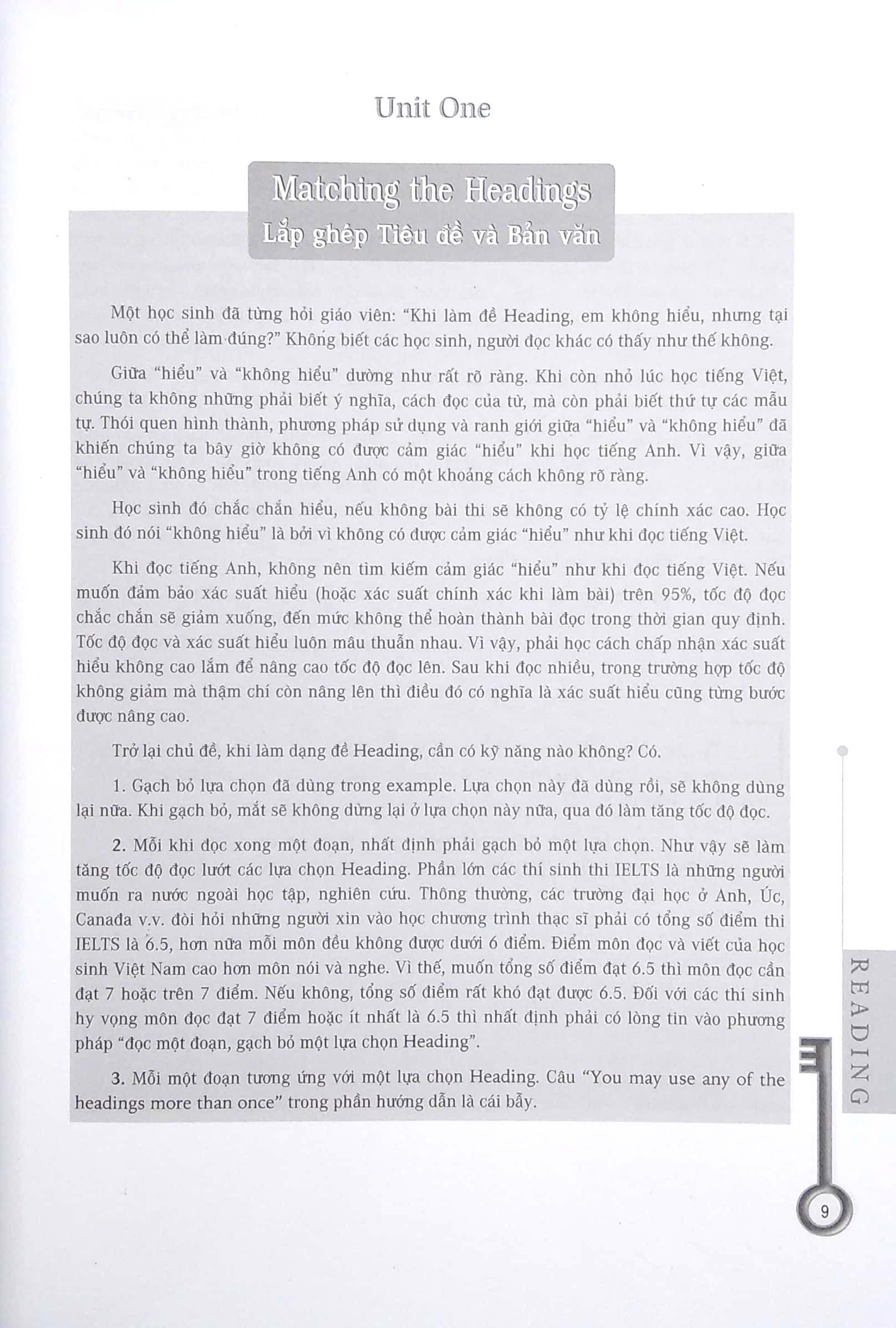 Bài đọc trong các kỳ thi IELTS khác với bài đọc tiếng Anh thường ngày và bài đọc trong các kỳ thi tiếng Anh khác. Thông thường, đọc là một phương thức thu thập thông tin, còn các bài đọc trong kỳ thi IELTS là thông qua việc đọc để giải quyết các vấn đề cụ thể. Nó cách khác, thông qua việc đọc để tìm ra đáp án của câu hỏi. Trong quá trình học và sử dụng tiếng Anh nhiều năm, các họ sinh phần nào hình thành các đọc riêng của m.ình. Những cách đọc này có lẽ rất hiệu quả trong học tập và công việc, nhưng khi áp dụng vào bài thi đọc IELTS có thể họ sẽ gặp khó khăn bởi các yếu tố như thời gian có hạn, dạng đề đặc biệt …. Vì vậy, tác giả đề nghị khi làm bài tập trong cuốn sách này, trước hết phải hiểu chỉ dẫn (instruction), làm rõ nhiệm vụ (task), cần biết phải hoàn thành trong thời gian bao lâu (suggested time), sau đó bắt đầu đọc. Trong cuốn sách này, người đọc cần chú trông việc nâng cao kỹ năng đọc, đồng thời tìm ra cách đọc thích hợp với từng dạng đề.