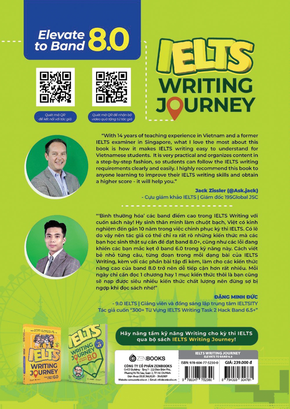1. Ielts writing journey: elevate to band 8.0 Tác giả: Bùi Thành Việt Nhà phát hành: Zenbooks Nhà xuất bản: NXB Thế Giới Năm xuất bản: 2024 Mã sản phẩm: 8794069304781 Số trang: 268