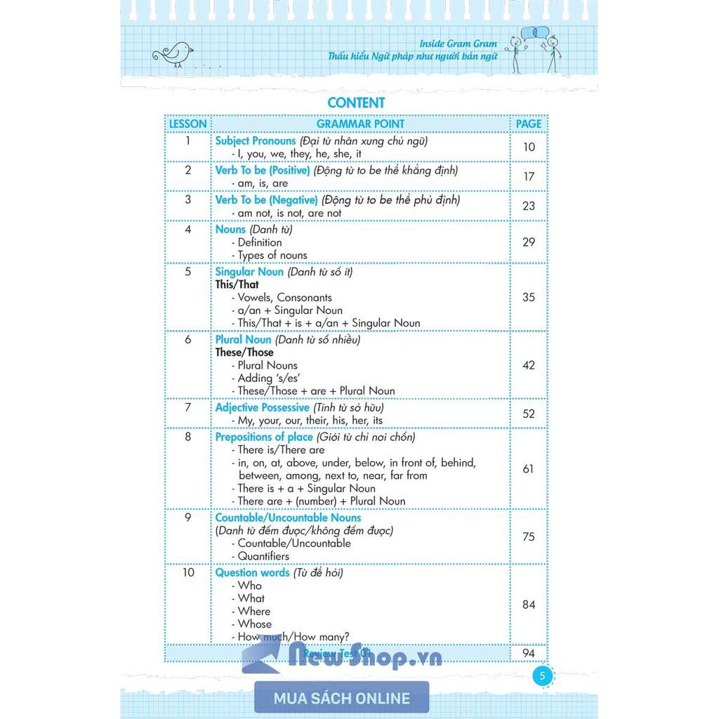 Sách Inside Gram Gram là bộ sách đầu tiên và duy nhất tại Việt Nam giúp người học tiếp cận ngữ pháp qua hình ảnh. Bộ sách dành cho những người mới bắt đầu học tiếng Anh hay ngay cả người mất gốc ngữ pháp, bởi những phương pháp học sáng tạo và tiến bộ.