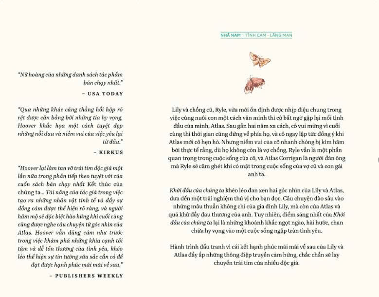 Khởi đầu của chúng ta khéo léo đan xen hai góc nhìn của Lily và Atlas, đưa đến một trải nghiệm thủ vị cho bạn đọc. Câu chuyện đào sâu vào những mâu thuẫn không chi của gia đình Lily, mà còn của Atlas và quá khứ đầy đau thương của anh. Tuy nhiên, điểm sáng nhất của Khởi đầu của chúng ta lại là những khoảnh khắc ngọt ngào, hài hước, chan chứa hy vọng vào một cuộc sống ngập tràn tình yêu.