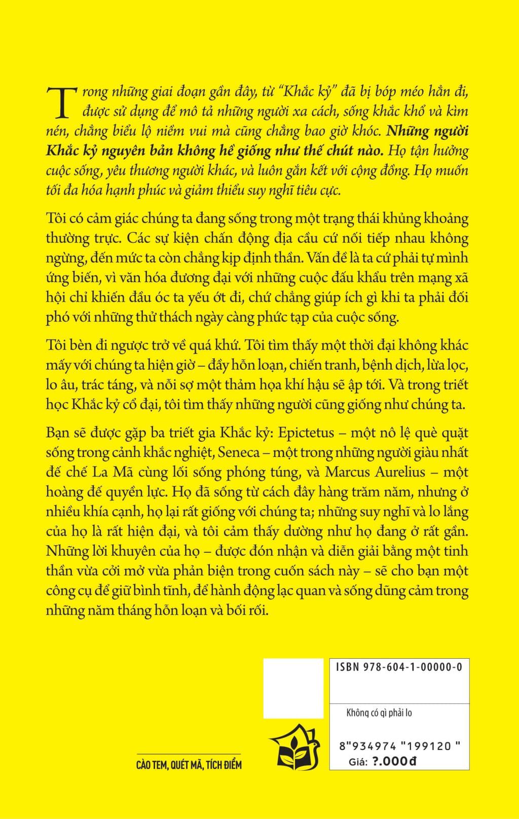 Tác giả là nhà báo, cây viết lâu năm. Bà tiếp cận chủ nghĩa Khắc kỷ với tinh thần vừa cởi mở vừa phản biện. Cuốn sách phân tích và gạn lọc những công tụ từ triết lý Khắc kỷ cổ xưa, đặt nó vào cuộc sống hiện đại, chỉ cho con người hiện đại một cách nữa để đối mặt với những vấn đề đương thời. Sách chia thành những bài viết ngắn có tiêu đề bắt đầu bằng “Làm sao để…”, ví dụ như: