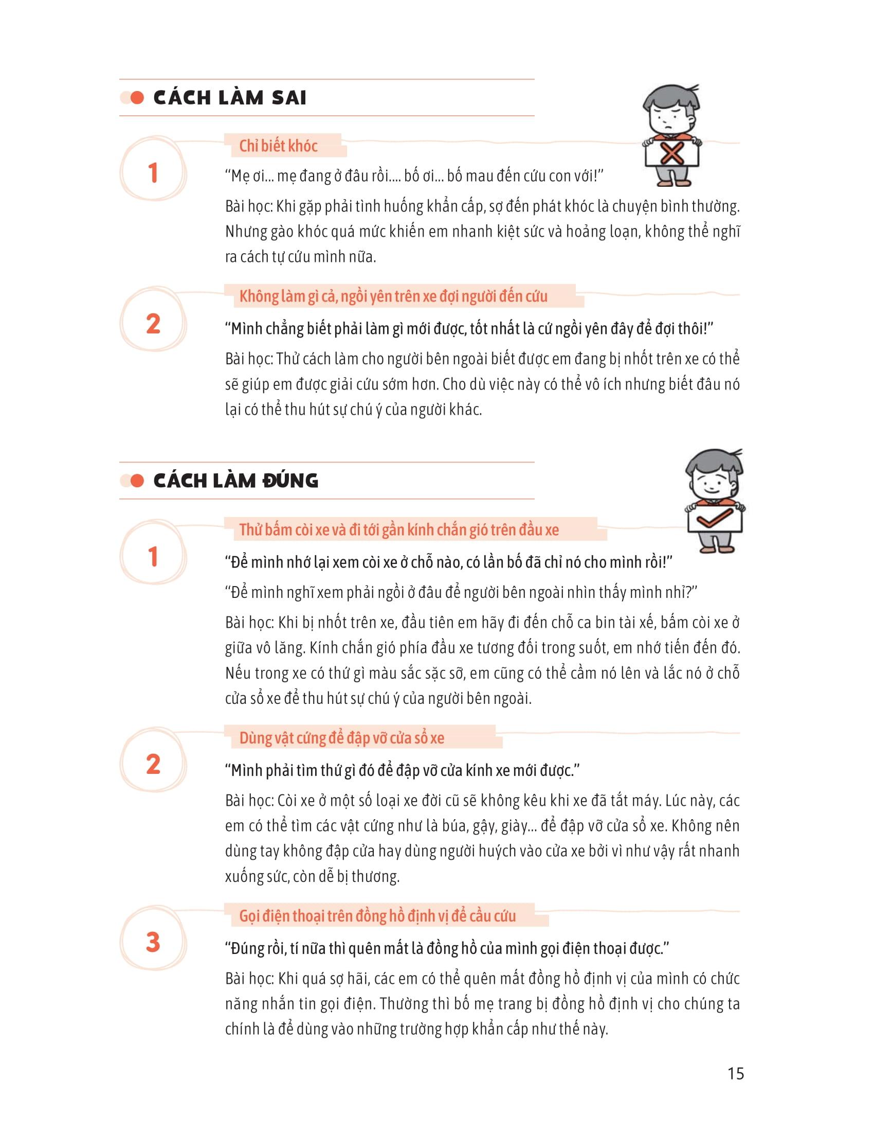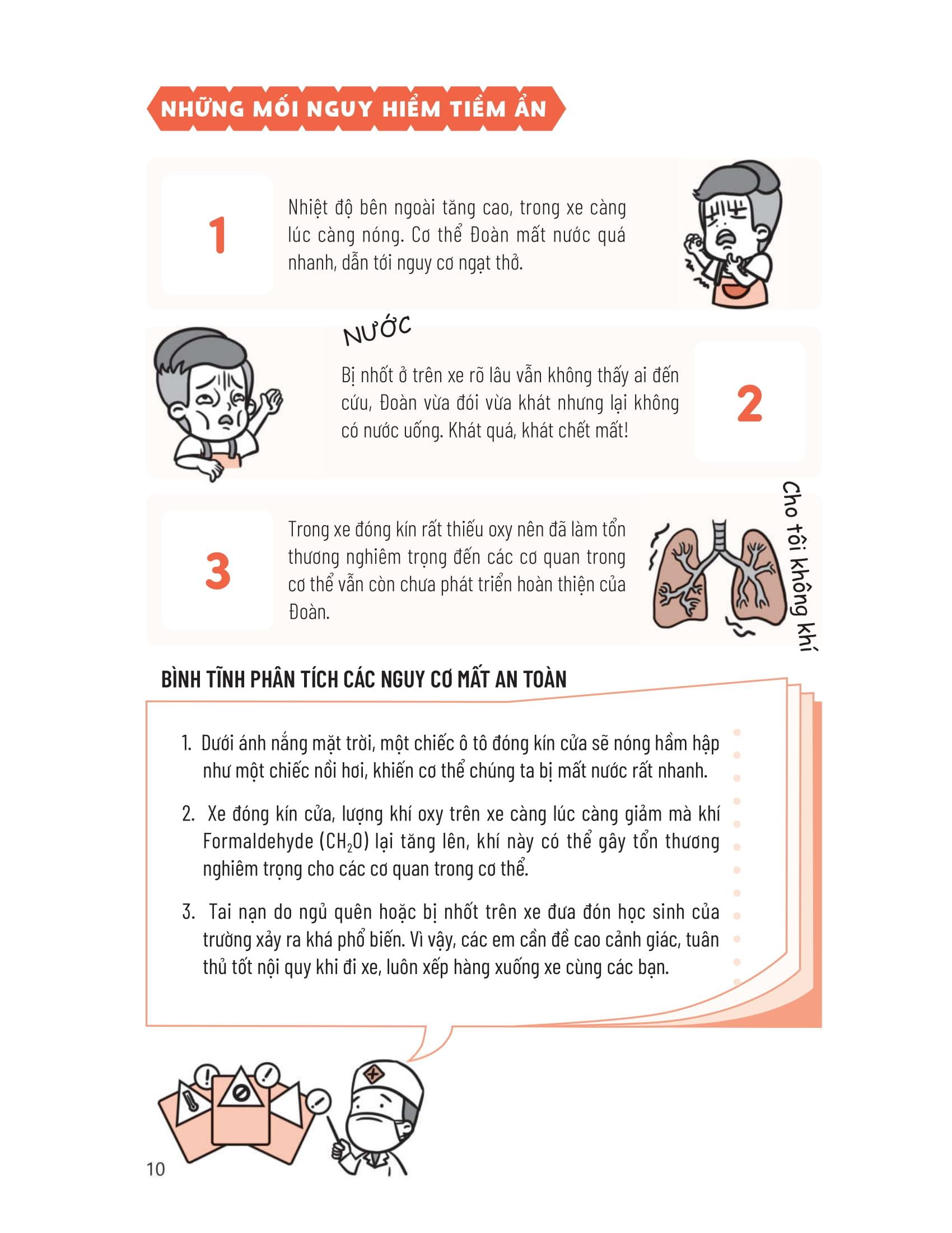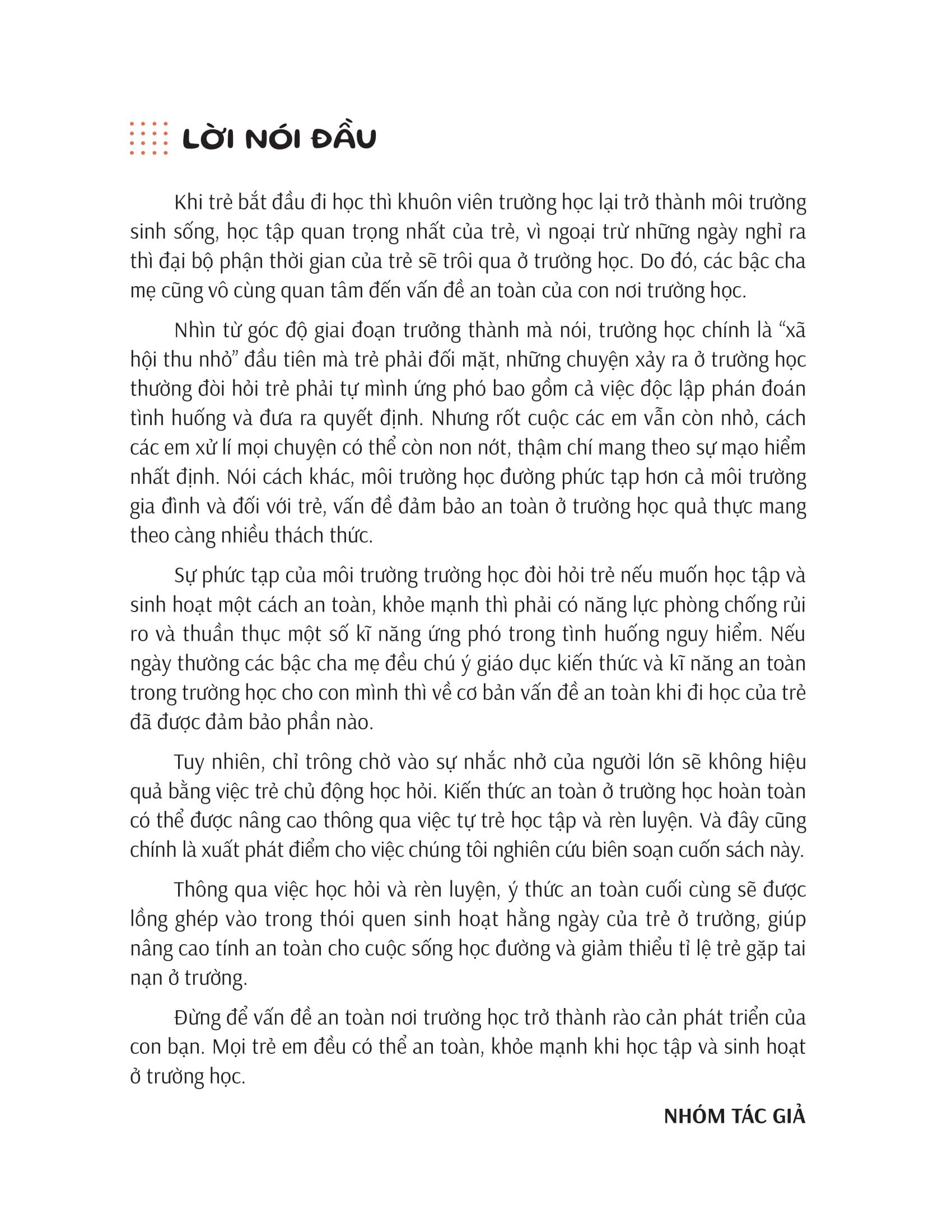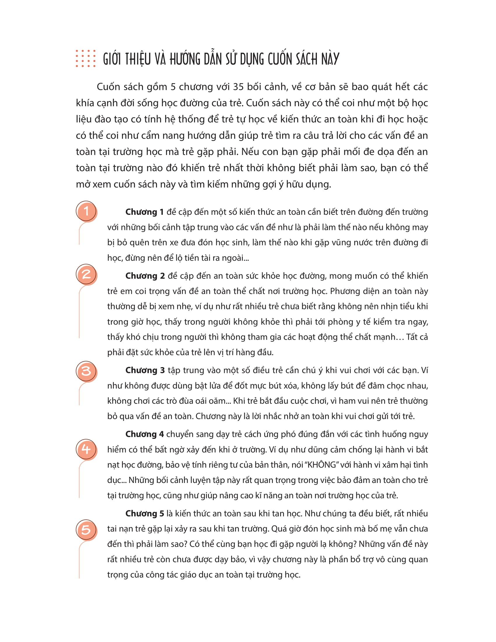 Cuốn sách gồm 5 chương với 35 bối cảnh, về cơ bản sẽ bao quát hết các khía cạnh đời sống học đường của trẻ. Cuốn sách này có thể coi như một bộ học liệu đào tạo có tính hệ thống để trẻ tự học về kiến thức an toàn khi đi học hoặc có thể coi như cẩm nang hướng dẫn giúp trẻ tìm ra câu trả lời cho các vấn đề an toàn tại trường học mà trẻ gặp phải.