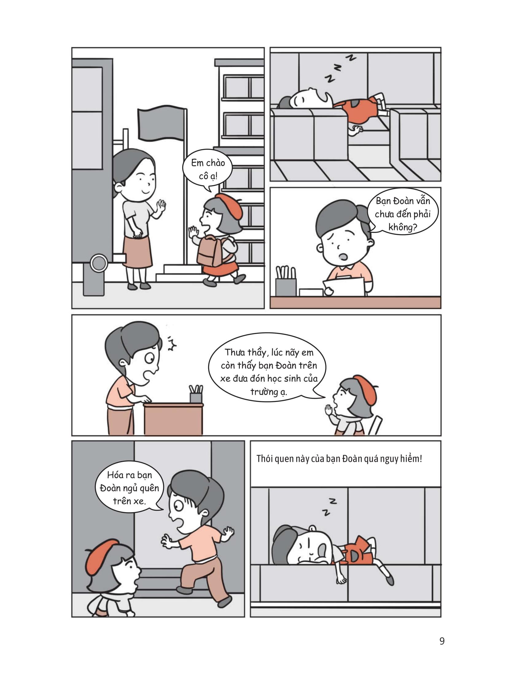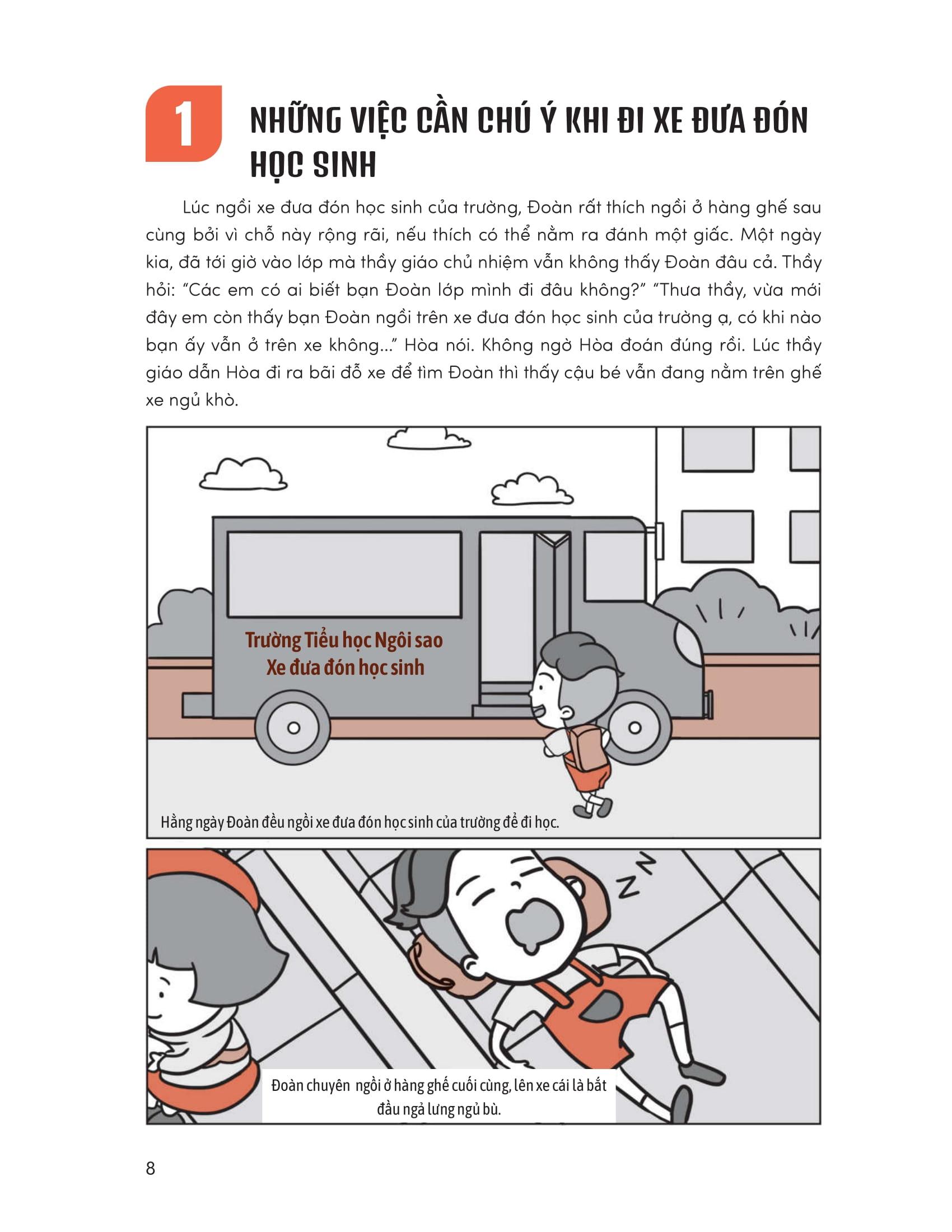 Chương 1 đề cập đến một số kiến thức an toàn cần biết trên đường đến trường với những bối cảnh tập trung vào các vấn đề như là phải làm thế nào để nếu không may bị bỏ quên trên xe đưa đón học sinh, làm thế nào khi gặp vũng nước trên đường đi học, đừng nên để lộ tiền ra ngoài...