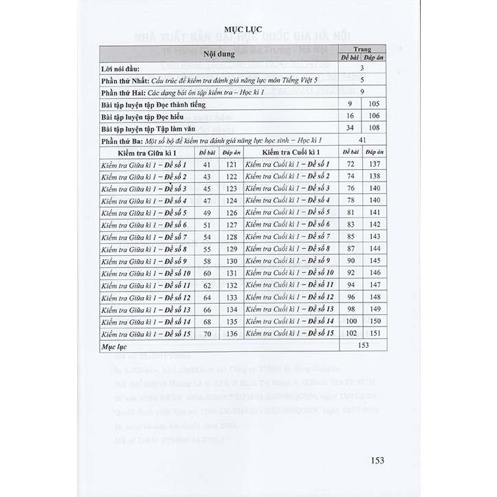Mỗi tập gồm 30 bộ đề (15 bộ đề giữa kì và 15 bộ đề cuối kì) được biên soạn riêng cho các bộ sách: Chân trời sáng tạo, Kết nối tri thức với cuộc sống và Cánh Diều (mỗi bộ sách gồm 5 đề giữa kì và 5 đề cuối kì). Với mỗi bộ đề, chúng tôi biên soạn theo cấu trúc thống nhất, bao gồm các câu hỏi và bài tập ở 3 mức độ khác nhau được lồng ghép giữa hai hình thức trắc nghiệm và tự luận có nội dung theo chương trình Sách giáo khoa Tiếng Việt 5, Chương trình giáo dục phổ thông 2018. Phần cuối mỗi tập đều có hướng dẫn cách làm các dạng bài luyện tập cho mỗi mức độ cũng như các bộ đề kiểm tra cho từng bộ sách nhằm đáp ứng yêu cầu của học sinh và phụ huynh.