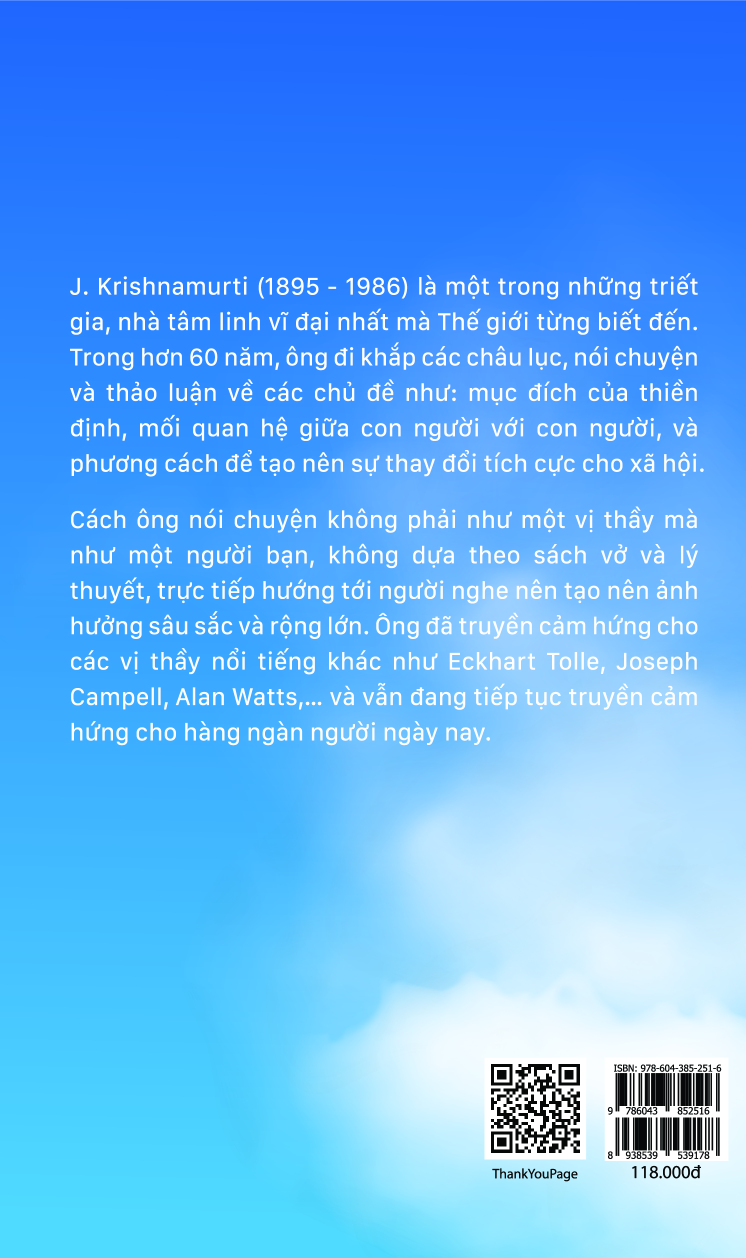 Jiddu Krishnamurti là một trong những triết gia, nhà tâm linh vĩ đại nhất mà thế giới từng biết. Ngài là nhà diễn thuyết tâm linh tài năng, về các chủ đề như mục đích của thiền định, mối quan hệ giữa con người, và phương cách để tạo nên sự thay đổi xã hội tích cực trên phạm vi toàn cầu…