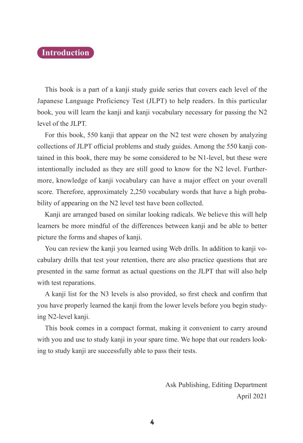 Bao gồm 550 chữ Hán tự thường được ra trong các Kỳ thi năng lực Nhật ngữ cấp độ N2. Bao gồm các đặc trưng:
