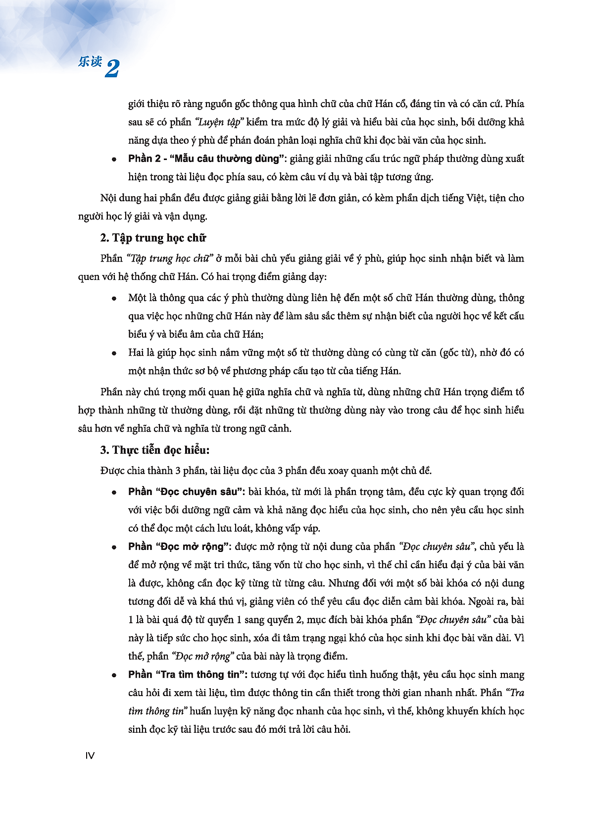 3. Thử thách bản thân Mảng này là phần bài tập được thiết kế nhằm vào nội dung bài học. Việc thiết kế bài tập dựa theo nguyên tắc từ dễ đến khó, từ nội dung trong bài mở rộng đến ngoại khóa, từ chữ, từ (hoặc cụm từ), câu lại đến đoạn văn, từng bước dẫn dắt học sinh nắm vững nội dung bài học, đồng thời có thể dần dần hoàn thành bài tập một cách độc lập. Phần “Tập viết chữ Hán” chủ yếu để học sinh hoàn thành nhiệm vụ viết chữ trong ô vuông trên cơ sở nhận đọc chữ Hán và hiểu được nghĩa chữ, làm sâu sắc hơn sự lý giải và nắm vững về quy tắc kết cấu chữ Hán của học sinh. Nhằm vào những từ mới trọng điểm của mỗi bài, chúng tôi đã thiết kế bài tập “Chọn từ điền trống”. Mục đích chủ yếu của bài tập “Chọn câu trả lời thích hợp” là giúp người học nhận đọc câu trong ngữ cảnh. Phần “Câu đố” có độ khó nhất định, chủ yếu là để kiểm tra xem học sinh có am hiểu về cấu tạo, cách viết và các kiến thức có liên quan đến chữ Hán hay không, đáp án câu đố đều đến từ những chữ trọng điểm và những từ thường dùng xuất hiện trong bài đó. Theo sự gia tăng của lượng chữ mà người học phải học, bắt đầu từ bài 6, chúng tôi dùng những câu đơn giản cùng với từ mới xuất hiện trong bài đó để viết lại những mẩu truyện cười, mục đích là tái hiện và củng cố lại những nội dung đã học trong bài, bồi dưỡng hứng thú đọc cho học sinh. Để tiện cho học sinh lý giải nội dung giáo trình, tăng thêm sự thú vị, mỗi bài đều có kèm các hình minh họa phong phú. Kiến nghị giảng dạy Mỗi bài trong quyển giáo trình này kiến nghị thời gian giảng dạy là 2 đến 4 tiết. Cả bài 1 và bài 2 kiến nghị nên hoàn thành trong 4 tiết. Từ bài 3 đến bài 9, kiến nghị mỗi bài nên hoàn thành trong 3-4 tiết. Ở tiết thứ nhất, kết hợp với chữ ví dụ để giảng dạy nội dung của phần “Ngân hàng tri thức”, sau đó thông qua phần “Luyện tập” để kiểm tra mức độ nắm bắt kiến thức cơ bản của học sinh; từ tiết thứ 2 đến tiết thứ 4, dựa theo sự sắp xếp của phần “Tập trung học chữ” để giới thiệu và giảng giải các chữ Hán thường dùng, sau đó tiến hành huấn luyện nhận đọc theo thứ tự chữ → từ → câu → đoạn, mở rộng vốn từ, bồi dưỡng hứng thú đọc và kỹ năng đọc, cuối cùng hoàn thành bài tập ở phần “Thử thách bản thân”. Mục đích môn đọc hiểu không phải là viết, nhưng đối với những học sinh mới bắt đầu tiếp xúc với tiếng Trung thì việc vừa viết vừa nhận mặt chữ có thể giúp học sinh ghi nhớ chữ Hán hiệu quả hơn, thầy cô có thể tùy theo tình hình của học sinh mà xem xét việc cho thêm phần viết các chữ Hán cơ bản. Phần “Kiểm tra tổng kết” thầy cô có thể cho học sinh hoàn thành trên lớp, cũng có thể dùng làm đề kiểm tra giai đoạn, có thể hoàn thành trong 2 tiết. Các chữ trọng điểm, từ, câu ví dụ xuất hiện trong giáo trình với số lượng vừa phải, thầy cô có thể tùy theo tình hình của học sinh để chọn dùng một cách linh hoạt. Nếu học sinh có trình độ khá cao, thầy cô có thể cân nhắc bổ sung thêm chữ ví dụ, từ ví dụ, câu ví dụ; nếu học sinh có trình độ hơi thấp, thầy cô có thể chỉ giảng nội dung của phần “Học để nhớ”, bỏ qua nội dung phần “Học để đọc”, cũng có thể xem xét tăng thêm thời lượng học. Trên đây là một số thuyết minh về mục tiêu giảng dạy, đối tượng thích hợp sử dụng, nội dung thể lệ và phương pháp sử dụng “Le Du - Giáo trình môn Đọc hiểu tiếng Trung, quyển 2”, xin đưa ra để tham khảo.
