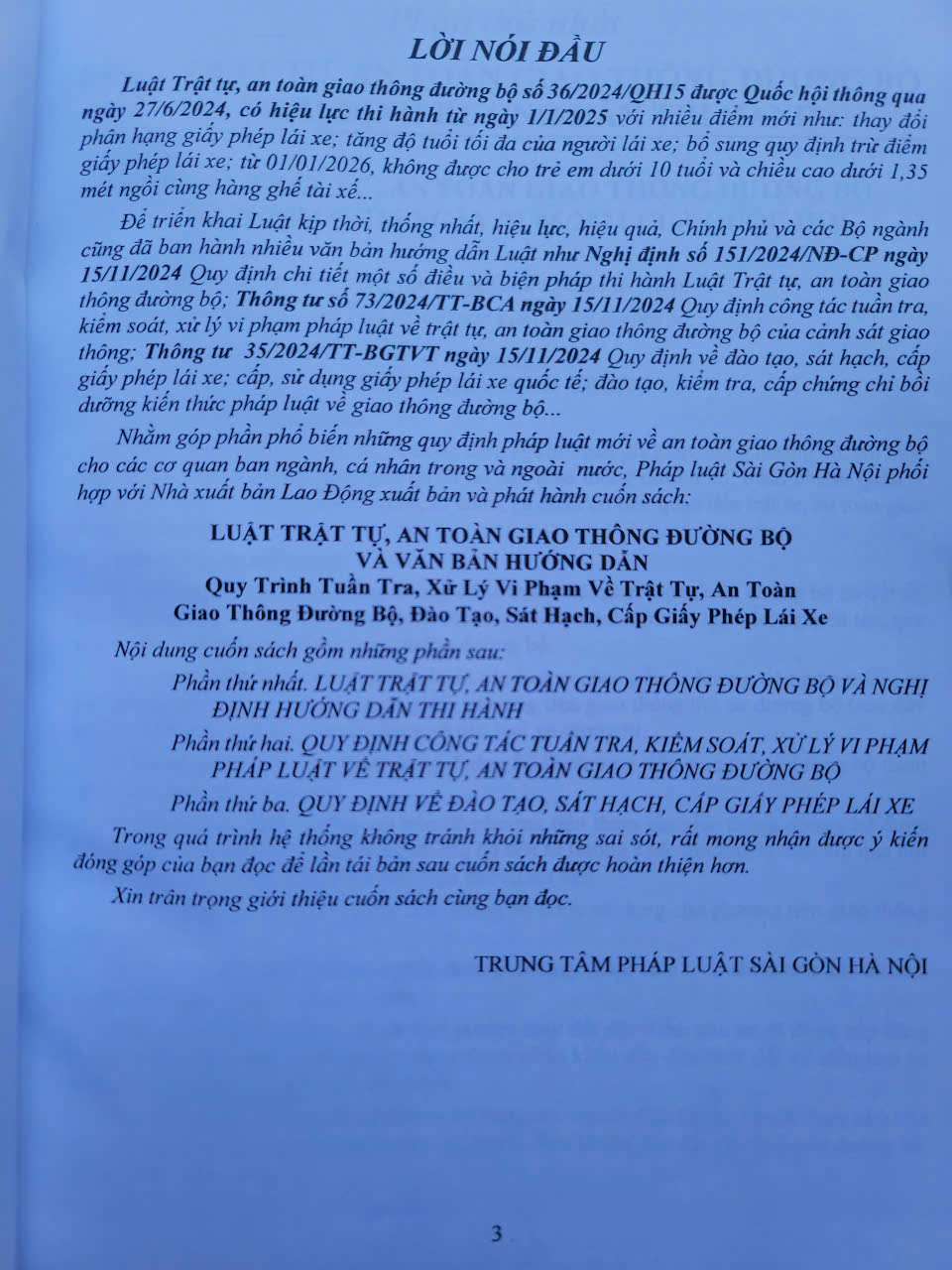 - Toàn bộ sách bìa mềm khổ lớn 20 x 28 cm phân phối bởi Nhà sách Nam Việt đều được bọc sách Plastic MIỄN PHÍ và xuất hóa đơn điện tử đầy đủ, nhanh chóng. ...//… Lời giới thiệu: Luật Trật tự, an toàn giao thông đường bộ số 36/2024/QH15 được Quốc hội thông qua ngày 27/6/2024, có hiệu lực thi hành từ ngày 01/01/2025 với nhiều điểm mới như: thay đổi phân hạng giấy phép lái xe; tăng độ tuổi tối đa của người lái xe; bổ sung quy định trừ điểm giấy phép lái xe; từ 01/01/2026, không được cho trẻ em dưới 10 tuổi và chiều cao dưới 1,35m ngồi cùng hàng ghế tài xế... Để triển khai Luật kịp thời, thống nhất, hiệu lực, hiệu quả, Chính phủ và các Bộ ngành cũng đã ban hành nhiều văn bản hướng dẫn Luật như Nghị định số 151/2024/NĐ-CP ngày 15/11/2024 Quy định chi tiết một số điều và biện pháp thi hành Luật Trật tự, an toàn giao thông đường bộ; Thông tư số 73/2024/TT-BCA ngày 15/11/2024 Quy định công tác tuần tra, kiểm soát, xử lý vi phạm pháp luật về trật tự, an toàn giao thông đường bộ của cảnh sát giao thông; Nghị định số 168/2024/NĐ-CP ngày 26/12/2024 Quy định xử phạt vi phạm hành chính về trật tự, an toàn giao thông trong lĩnh vực giao thông đường bộ; trừ điểm, phục hồi điểm giấy phép lái xe... Nhằm góp phần phổ biến những quy định pháp luật về giao thông đường bộ cho các cơ quan ban ngành, cá nhân trong và ngoài nước, Nhà sách Nam Việt xin trân trọng giới thiệu cuốn sách: Luật Trật Tự, An Toàn Giao Thông Đường Bộ Và Văn Bản Hướng Dẫn Quy Trình Tuần Tra, Xử Lý Vi Phạm Về Trật Tự, An Toàn Giao Thông Đường Bộ, Đào Tạo, Sát Hạch, Cấp Giấy Phép Lái Xe …//… Nội dung cuốn sách gồm 4 phần sau: Phần thứ nhất. Luật trật tự, an toàn giao thông đường bộ và nghị định hướng dẫn thi hành Phần thứ hai. Quy định công tác tuần tra, kiểm soát, xử lý vi phạm pháp luật về trật tự, an toàn giao thông đường bộ Phần thứ ba. Quy định về đào tạo, sát hạch, cấp giấy phép lái xe Phần thứ tư. Quy định về xử phạt vi phạm hành chính trong lĩnh vực giao thông đường bộ *** Quý khách hàng hãy an tâm khi mua sách tại Nhà sách Nam Việt, cam kết uy tín, chất lượng, sách bản gốc chuẩn đẹp, được kiểm hàng, hài lòng mới thanh toán, sách đã được bọc plastic cao cấp miễn phí! …//… Cảm ơn các bạn đã ghé thăm shop Nhà sách Nam Việt ! Sách Luật Trật Tự, An Toàn Giao Thông Đường Bộ Và Văn Bản Hướng Dẫn Quy Trình Tuần Tra, Xử Lý Vi Phạm Về Trật Tự, An Toàn Giao Thông Đường Bộ, Đào Tạo, Sát Hạch, Cấp Giấy Phép Lái Xe Sách Luật Trật Tự, An Toàn Giao Thông Đường Bộ Và Văn Bản Hướng Dẫn Quy Trình Tuần Tra, Xử Lý Vi Phạm Về Trật Tự, An Toàn Giao Thông Đường Bộ, Đào Tạo, Sát Hạch, Cấp Giấy Phép Lái Xe