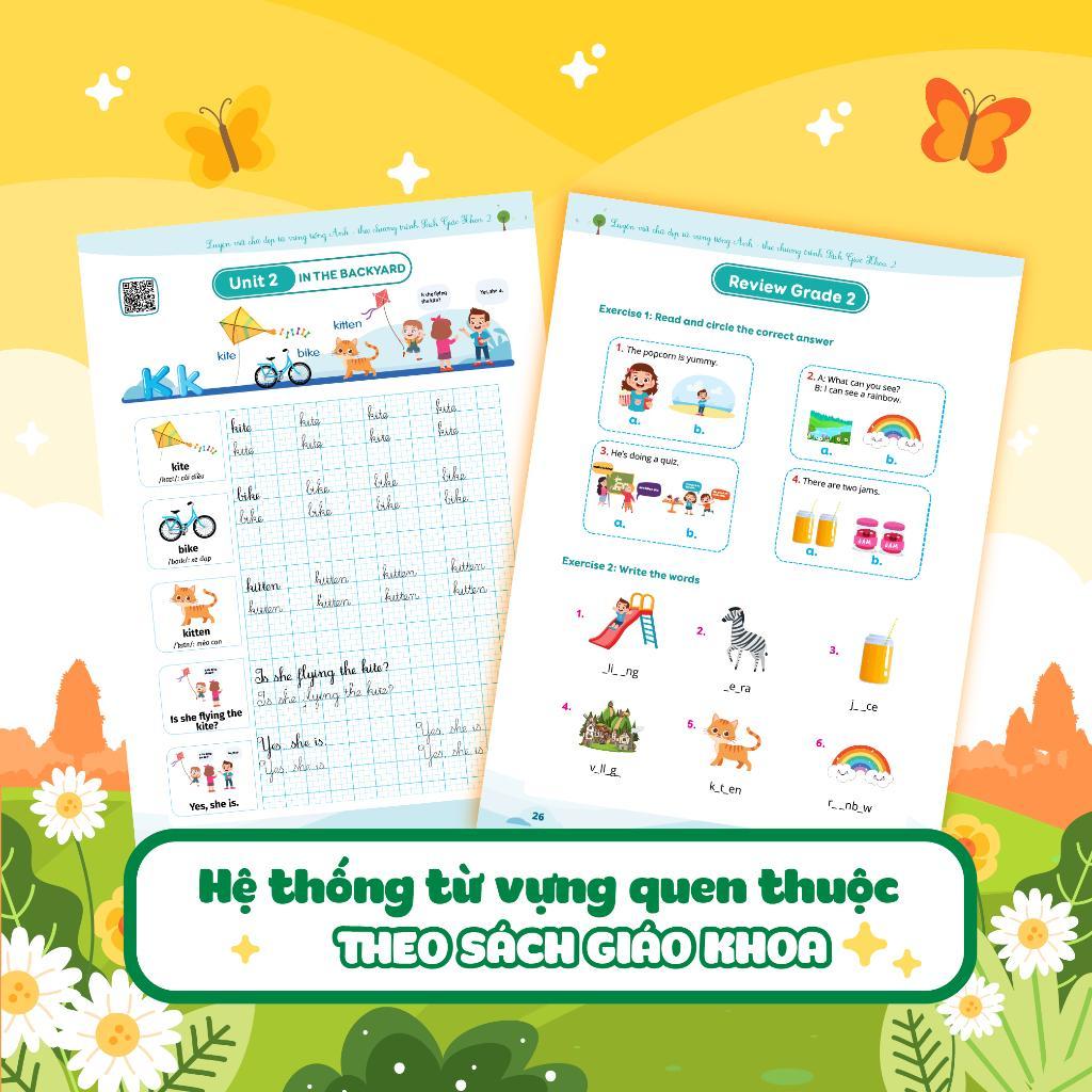- Hệ thống từ vựng quen thuộc theo chương trình sách giáo khoa Các chủ đề, chủ điểm từ vựng trong sách cũng chính là các chủ để cơ bản và thường gặp với đời sống thường ngày. Bởi vậy, việc ghi nhớ bộ từ vựng này cũng sẽ giúp con tăng cường vốn từ vựng phong phú để ứng dụng trong giao tiếp hàng ngày. Kèm sau mỗi bài học là những hoạt động thực hành thú vị, các con vừa được ôn lại từ vựng hiệu quả, vừa được thoải mái thư giãn.