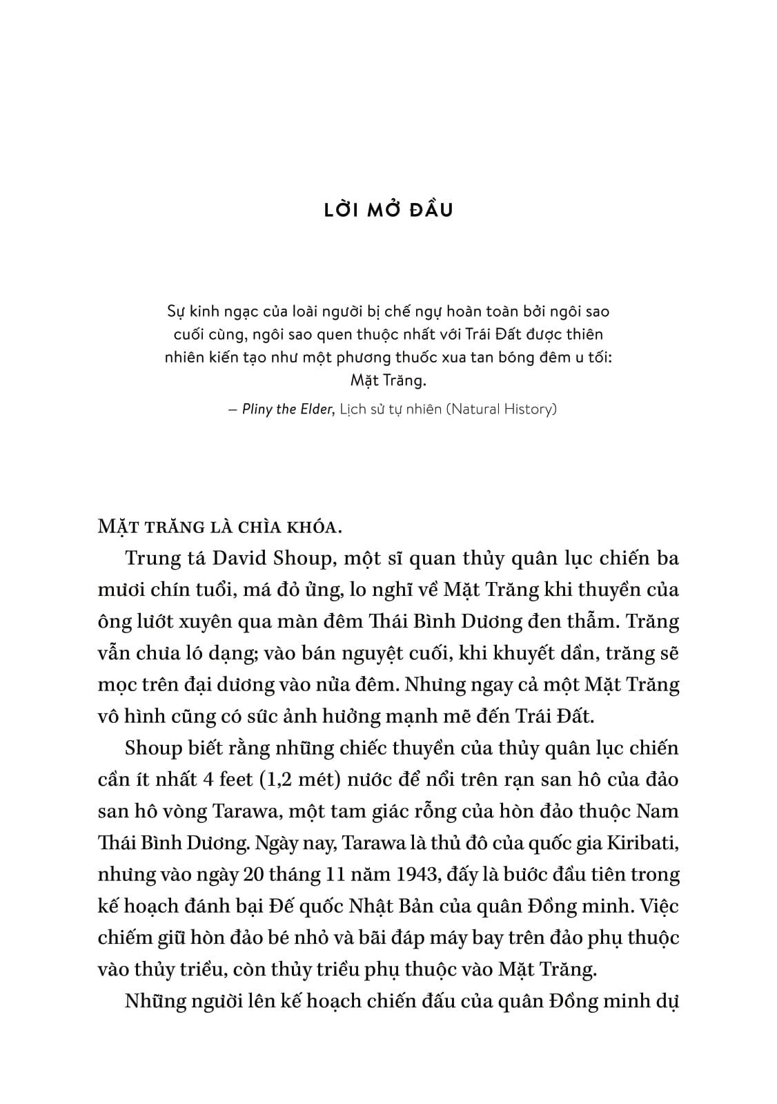 Lực hấp dẫn của Mặt Trăng đã ổn định quỹ đạo và khí hậu của Trái Đất. Nó kéo chất dinh dưỡng lên bề mặt của đại dương nguyên thủy, nơi nuôi dưỡng sự tiến hóa của sự sống phức tạp. Mặt Trăng tiếp tục ảnh hưởng đến di cư và sinh sản của động vật, sự sinh trưởng của thực vật và có thể cả dòng chảy của chính máu trong tĩnh mạch của chúng ta.