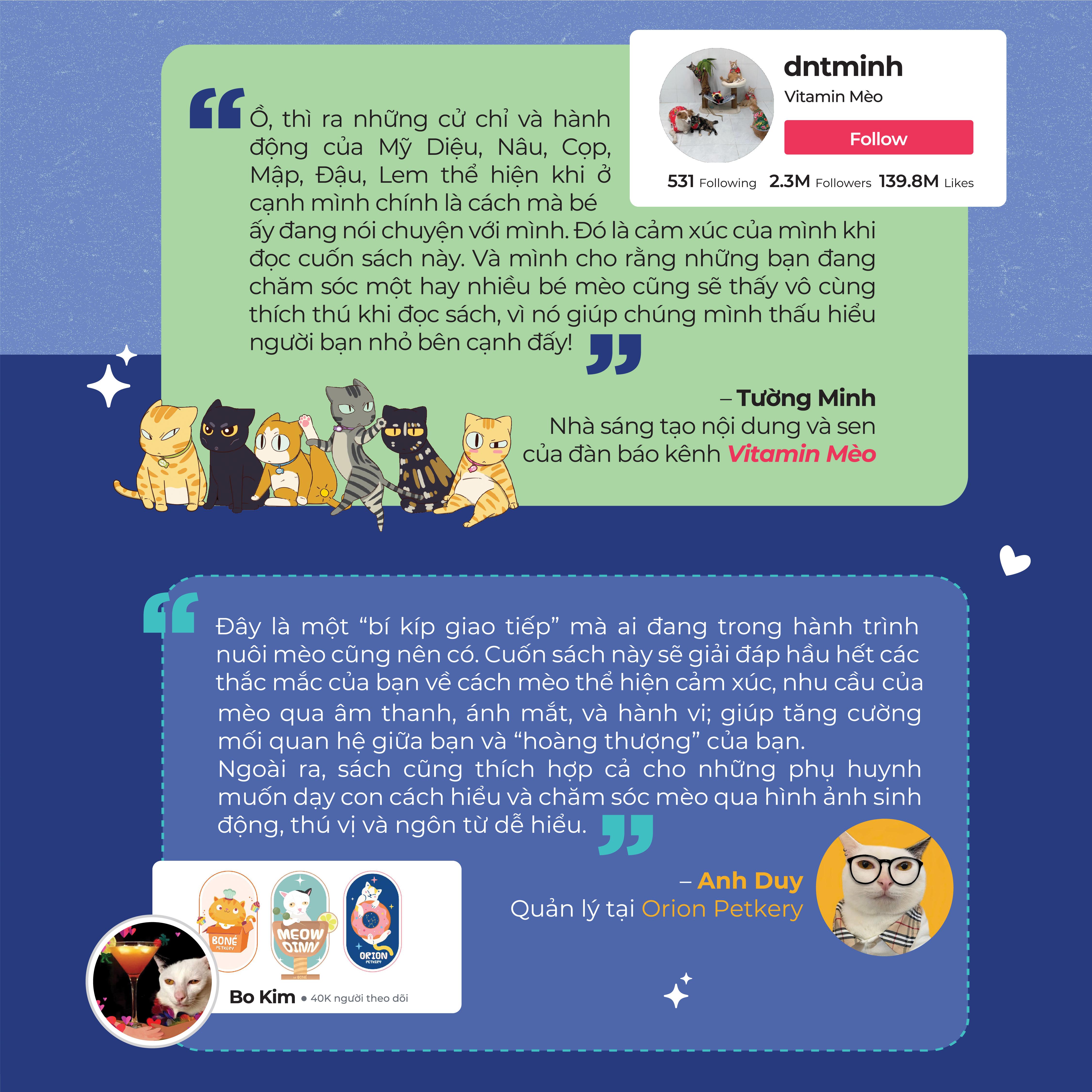 Anh Duy (Bo Kim) - Quản lý tại Orion Petkery: “Đây là một “bí kíp giao tiếp” mà ai đang trong hành trình nuôi mèo cũng nên có. Cuốn sách này sẽ giải đáp hầu hết các thắc mắc của bạn về cách mèo thể hiện cảm xúc, nhu cầu của mèo qua âm thanh, ánh mắt, và hành vi giúp tăng cường mối quan hệ giữa bạn và “hoàng thượng” của bạn.”