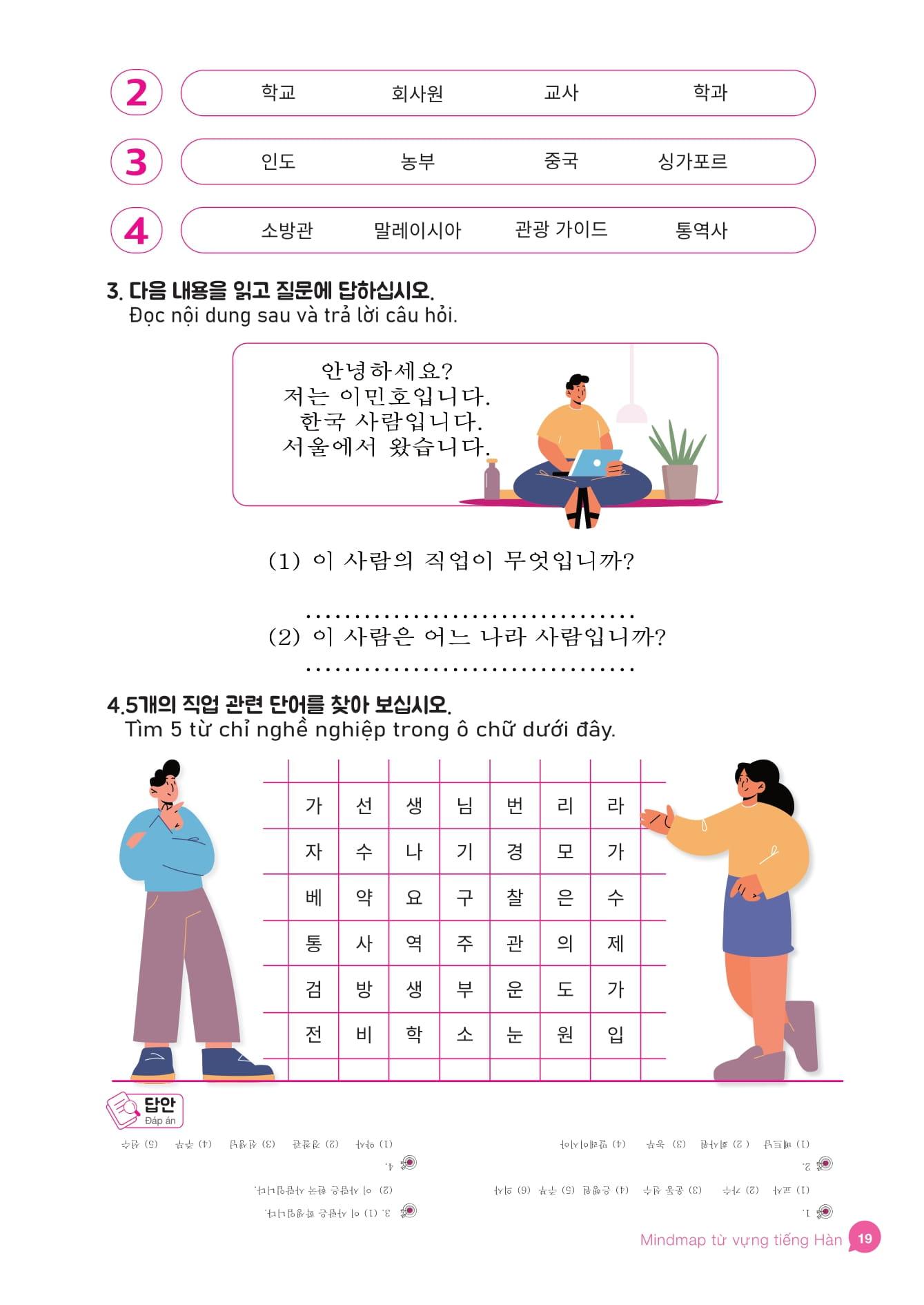 • Cuốn sách gồm 30 chủ đề từ vựng tiếng Hàn và được trình bày hoàn toàn bằng các mindmap. Các chủ đề được đề cập trong sách đều quen thuộc, hữu ích trong cuộc sống hàng ngày. Đi kèm với các chủ đề từ vựng là đa dạng các bài luyện tập khác nhau như nối từ, liên kết câu, điền vào chỗ trống,.. giúp người học hiểu sâu và biết cách vận dụng linh hoạt các từ đã học một cách hiệu quả.