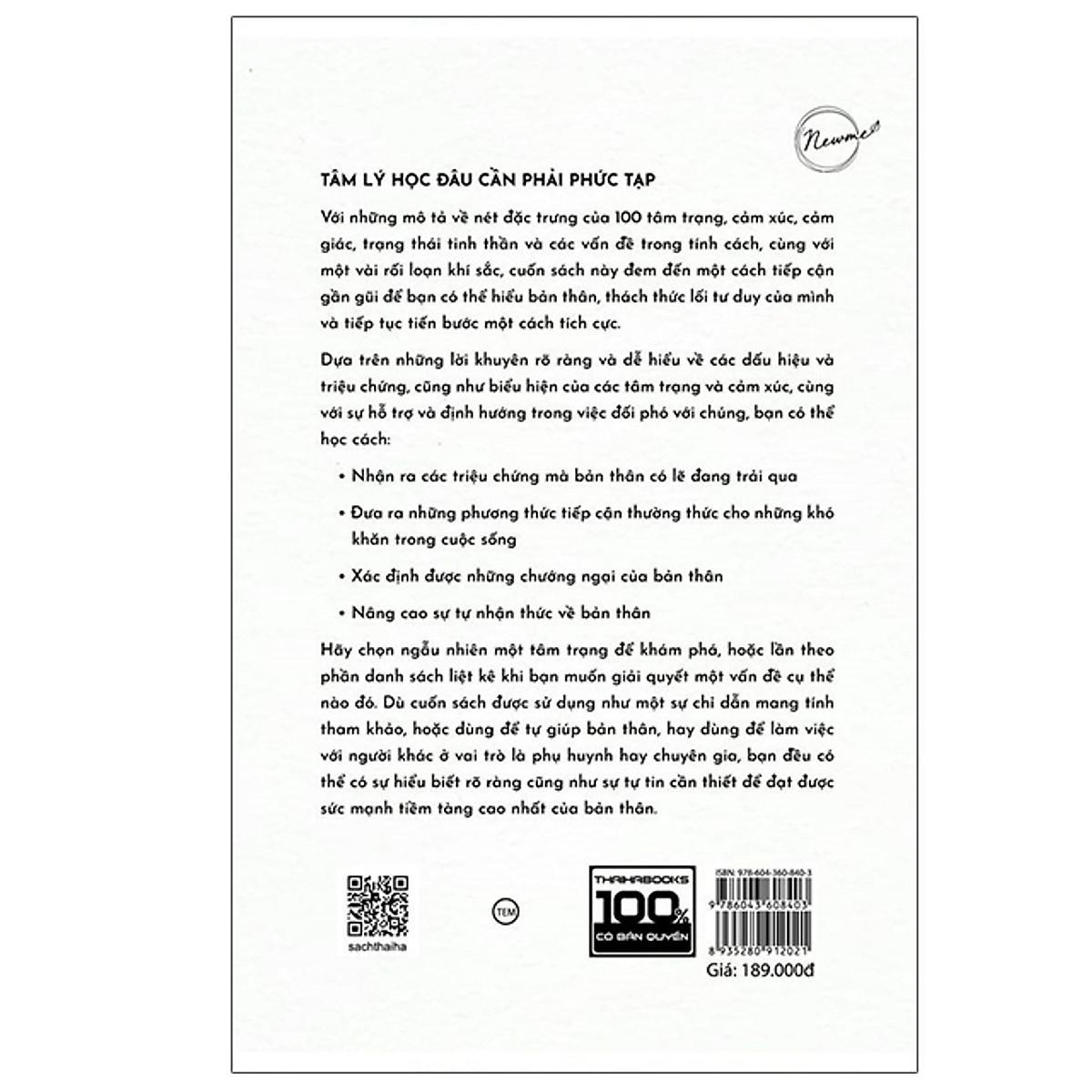 Với những mô tả về nét đặc trưng của 100 tâm trạng, cảm xúc, cảm giác, trạng thái tinh thần và các tật trong tính cách, cùng với một vài rối loạn khí sắc, cuốn sách này đem đến một cách tiếp cận gần gũi để bạn có thể hiểu bản thân, thách thức lối tư duy của mình và tiếp tục tiến bước theo một cách tích cực.