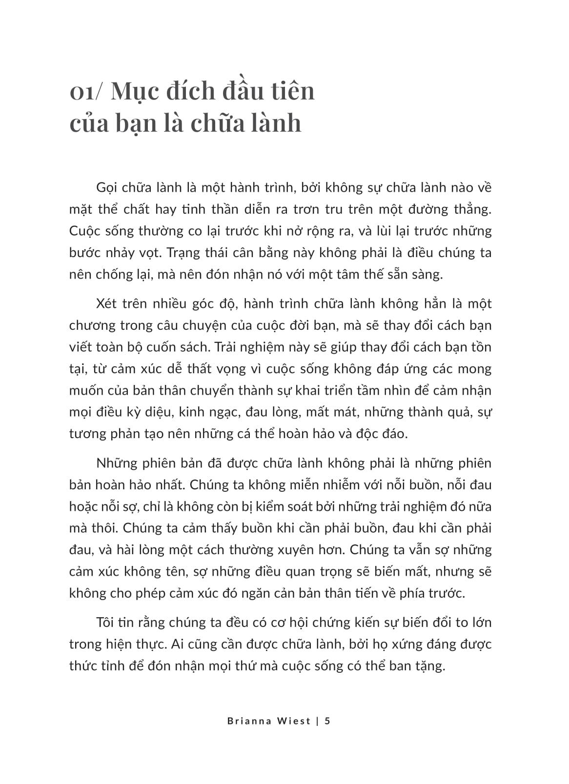 “Một cuốn sách chữa lành” là tuyển tập các ghi chép trên hành trình chữa lành của tác giả Brianna, từ một cô gái trẻ đầy tổn thương học cách vượt qua những biến cố, hàn gắn từng mảnh vỡ trong tâm hồn để trở thành người phụ nữ vững vàng và hạnh phúc trong hiện tại.