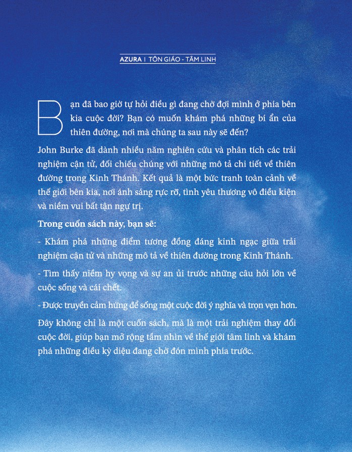 Nhà phát hành: Nhã Nam Nhà xuất bản: Thế Giới Tác giả: John Burke Dịch giả: Keo Số trang: 424 Kích thước: 15.5 x 24 cm Bạn đã bao giờ tự hỏi điều gì đang chờ đợi mình ở phía bên kia cuộc đời? Bạn có muốn khám phá những bí ẩn của thiên đường, nơi mà chúng ta sau này sẽ đến? John Burke đã dành nhiều năm nghiên cứu và phân tích các trải nghiệm cận tử, đối chiếu chúng với những mô tả chi tiết về thiên đường trong Kinh Thánh. Kết quả là một bức tranh toàn cảnh về thế giới bên kia, nơi ánh sáng rực rỡ, tình yêu thương vô điều kiện và niềm vui bất tận ngự trị. Trong cuốn sách này, bạn sẽ: Khám phá những điểm tương đồng đáng kinh ngạc giữa trải nghiệm cận tử và những mô tả về thiên đường trong Kinh Thánh.