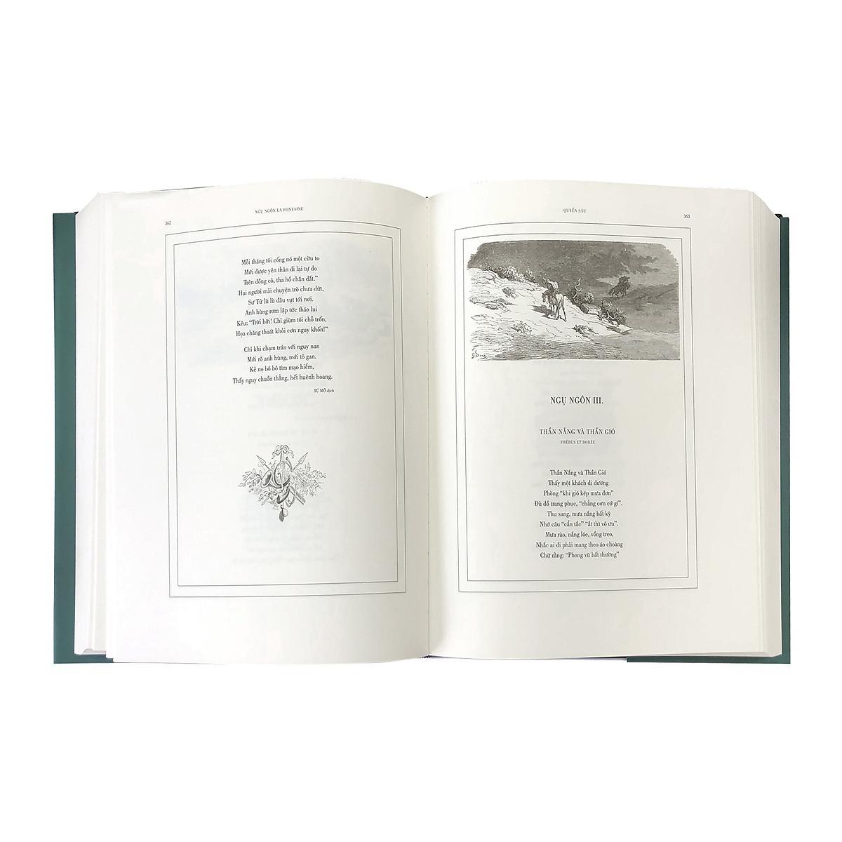 Nhà ngôn ngữ học, Nam tước Silvestre de Sacy đã nhận xét: “Ngụ ngôn La Fontaine mang đến niềm hứng khởi cho ba lứa độc giả khác nhau: các em nhỏ hân hoan với sự tươi mới và sinh động của câu chuyện, các sinh viên khoa văn háo hức với nghệ thuật thơ tuyệt diệu, còn người từng trải chìm đắm trong mạch chiêm nghiệm sâu sắc về tính cách và cuộc sống mà ngụ ngôn truyền tải.” Mượn điển tích từ thần thoại Hy Lạp, La Mã và ngụ ngôn của hai nhà hiền triết Ésope và Pilpay, đặt lời thơ vào miệng của những loài vật gần gũi, bằng giọng thơ hóm hỉnh, đôi khi pha chút giọng điệu châm biếm và khéo léo lồng ghép những bài học luân lý, ngụ ngôn La Fontaine đã trở thành món ăn tinh thần cho nhiều thế hệ độc giả. Tại Việt Nam, ngay từ đầu thế kỷ XX, khi chữ quốc ngữ mới được phổ biến, độc giả đã được thưởng thức ngụ ngôn La Fontaine qua các bản dịch thơ của học giả Nguyễn Văn Vĩnh được đăng báo từ năm 19 và in thành sách lần đầu vào năm 1916. Từ đó về sau, có không ít các tuyển tập thơ dịch ngụ ngôn La Fontaine ra đời nhờ công chuyển ngữ của nhiều dịch giả. Tuy nhiên, trải qua hơn một thế kỷ, bạn đọc trong nước vẫn chưa được tiếp cận bản dịch toàn tập ngụ ngôn La Fontaine, gồm 12 quyển với 240 ngụ ngôn, với cơ man kiến thức, giá trị nghệ thuật và luân lý được gói ghém trong những vần thơ tinh tế và trang nhã. Nhân dịp kỷ niệm 400 năm ngày sinh của thi hào Pháp, Đông A trân trọng giới thiệu đến bạn đọc ấn bản ngụ ngôn La Fontaine đầy đủ nhất từ trước đến nay. Ấn bản mới được thực hiện theo bản in năm 1868 của nhà Hachette, gồm 12 quyển với 240 ngụ ngôn từng được xuất bản trong sinh thời của La Fontaine và lời nói đầu của chính tác giả, kèm bài khảo cứu chi tiết về tiểu sử nhà thơ của Géruzez, với các bức minh họa sống động của họa sĩ bậc thầy Gustave Doré. Trong ấn bản này, Doré thực hiện 85 bức minh họa khổ lớn và gần 500 minh họa nhỏ, với hàng trăm hình tượng con người, thần thánh và các loài vật. Trong mỗi bức minh họa, người họa sĩ bậc thầy mở ra một không gian hữu hình và lôi cuốn độc giả bước vào thế giới ngụ ngôn sống động của La Fontaine. Về bản dịch thơ, bên cạnh các bài dịch quen thuộc của các dịch giả kỳ cựu như Nguyễn Văn Vĩnh, Tú Mỡ, Huỳnh Lý, Nguyễn Đình, bạn đọc sẽ được làm quen với các bản dịch của các cây bút mới. Sự hòa thanh của các dịch giả đời trước và các dịch giả đời nay trong ấn bản toàn tập La Fontaine đầu tiên ở Việt Nam sẽ phần nào mở ngỏ cho thấy sự phát triển của ngôn ngữ tiếng Việt trong suốt một thế kỷ qua.