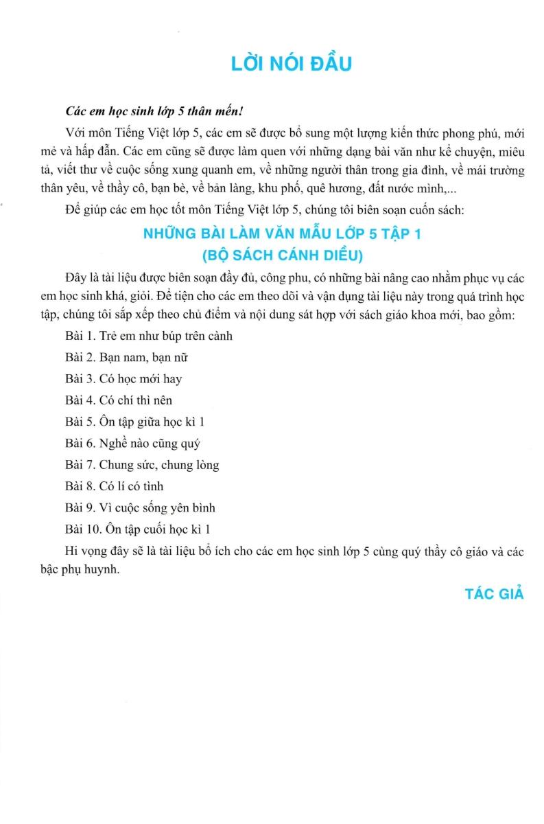 Những Bài Làm Văn Mẫu 5 - Tập 2 (Cánh Diều) Các em học sinh lớp 5 thân mến! Với môn Tiếng Việt lớp 5, các em sẽ được bổ sung một lượng kiến thức phong phú, mới mẻ và hấp dẫn. Các em cũng ...
