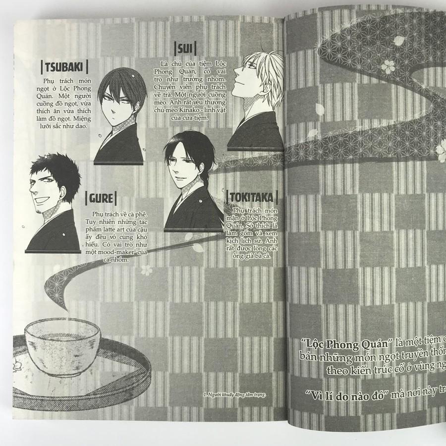 Sui, là người sở hữu Lộc Phong Quán, điềm đạm và khó đoán, chuyên gia về trà và là một người cuồng mèo đích thực. Gure, kẻ ruột để ngoài da, lúc nào cũng giữ vẻ tươi sáng rạng ngời, là chuyên gia pha chế đồ uống và có niềm đam mê bất tận với latte art. Tsubaki miệng lưỡi sắc lẻm, thấp bé nhẹ cân nhất nhóm, có sở trường làm đồ ngọt. Và Nagae Tokitaka, chàng đầu bếp trầm tính, rất được lòng các ông già bà cả. Bốn chàng trai “đẹp người, tốt nết” này chính là những người đã chung tay làm nên linh hồn của tiệm cà phê lâu đời này.