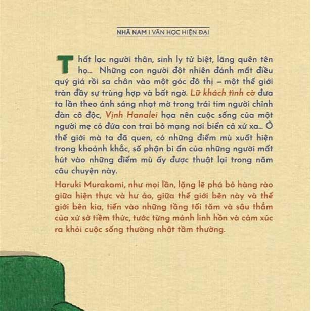 Thất lạc người thân, sinh ly tử biệt, lãng quên tên họ... Những con người đột nhiên đánh mất điều quý giá rồi sa chân vào một góc đô thị - một thế giới tràn đầy sự trùng hợp và bất ngờ. Lữ khách tình cờ đưa ta lần theo ánh sáng nhạt mờ trong trái tim người chỉnh đàn cô độc, Vịnh Hanalei họa nên cuộc sống của một người mẹ có đứa con trai bỏ mạng nơi biển cả xứ xa... Ở thế giới mà ta đã quen, có những điểm mù xuất hiện trong khoảnh khắc, số phận bí ẩn của những người mất hút vào những điểm mù ấy được thuật lại trong năm câu chuyện này.
