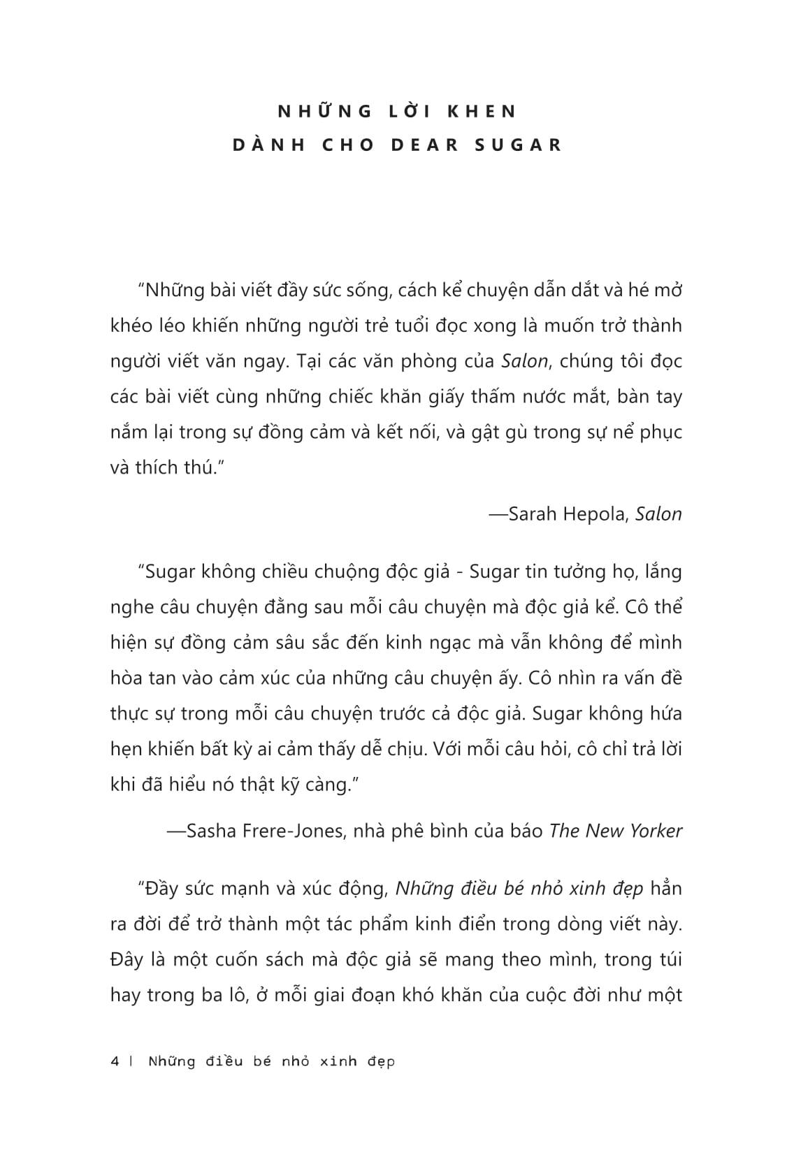 Những điều bé nhỏ xinh đẹp là tuyển tập những bài viết tinh túy nhất của Dear Sugar nhằm đưa những lời khuyên thông thái của cô đến cho độc giả đại chúng. Ấn bản kỷ niệm 10 năm này có 6 mục mới và cả lời tựa mới của tác giả. Hài hước, sâu lắng và đầy trắc ẩn - cũng như sự chân thành tuyệt đối - cuốn sách này là liều thuốc xoa dịu mọi gian truân mà cuộc sống đem đến cho chúng ta.