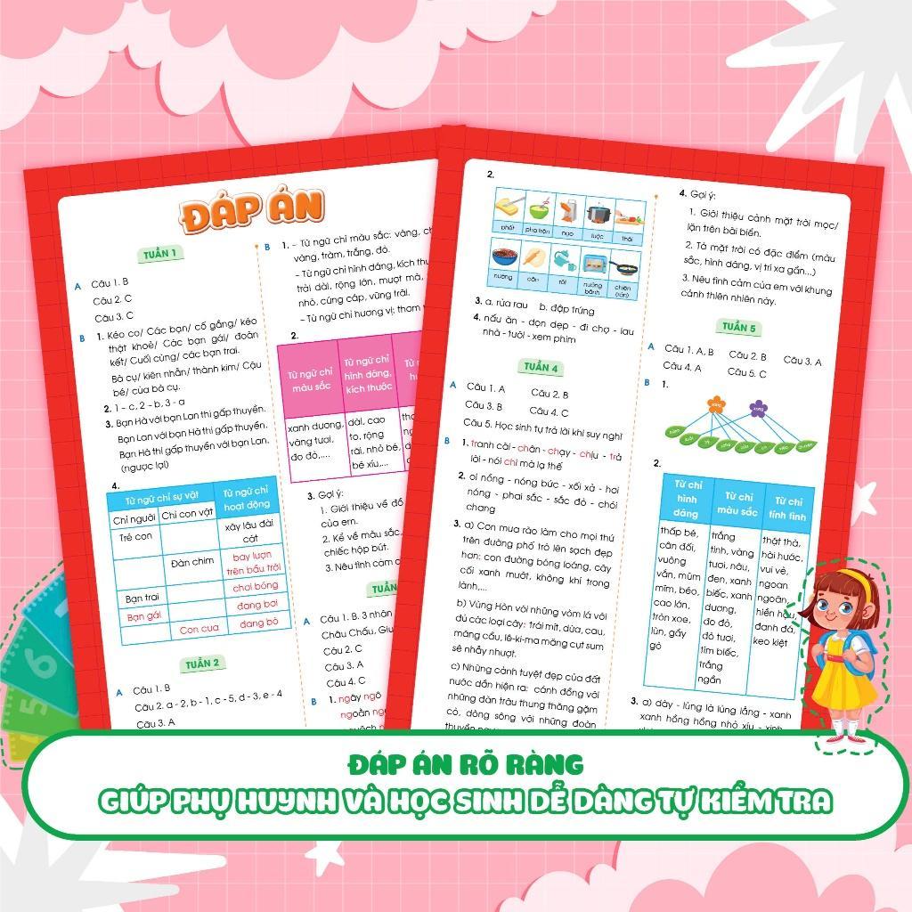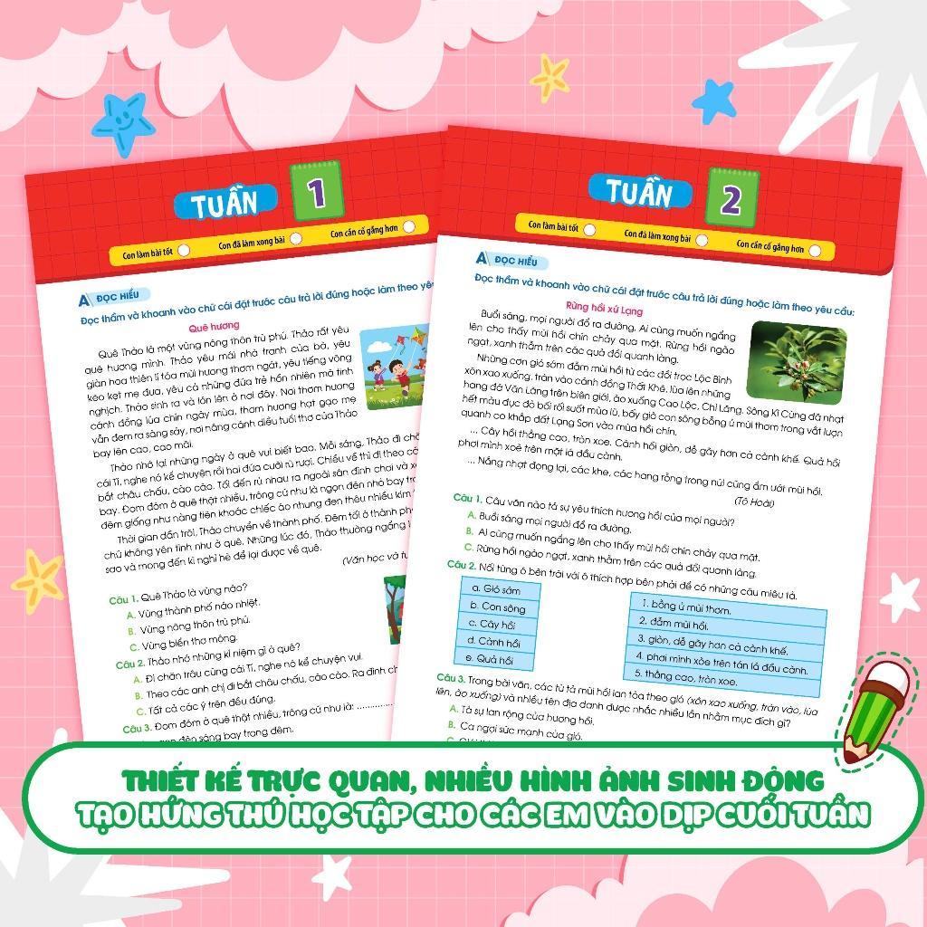 - Hệ thống các bài tập phong phú, mang tính tổng hợp và ôn luyện toàn diện. Hệ thống bài tập đa dạng, lượng phù hợp với việc học cuối tuần để các con vẫn có thời gian thư giãn và vui chơi. Đặc biệt, sau mỗi kì sẽ có bài ôn tập giữa kì và cuối kì giúp con có tài liệu ôn tập cho các kì kiểm tra.