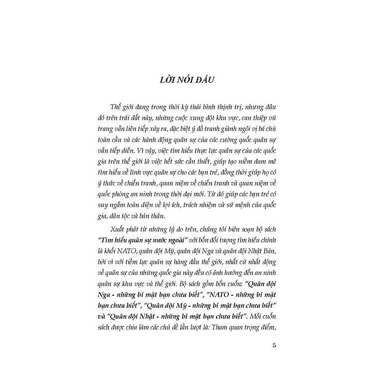 Thế giới đang trong thời kỳ thái bình thịnh trị, nhưng đâu đó trên trái đất này, những cuộc xung đột khu vực, can thiệp vũ trang vẫn liên tiếp xảy ra, đặc biệt ý đồ tranh giành ngôi vị bá chủ toàn cầu và các hành động quân sự của các cường quốc quân sự vẫn tiếp diễn. Vì vậy, việc tìm hiểu thực lực quân sự của các quốc gia trên thế giới là việc hết sức cần thiết, giúp tạo niềm đam mê tìm hiểu về lĩnh vực quân sự cho các bạn trẻ, đồng thời giúp họ có ý thức về chiến tranh, quan niệm về chiến tranh và quan niệm về quốc phòng an ninh trong thời đại mới. Từ đó giúp các bạn trẻ có suy ngẫm toàn diện về lợi ích, trách nhiệm và sứ mệnh của quốc gia, dân tộc và bản thân.
