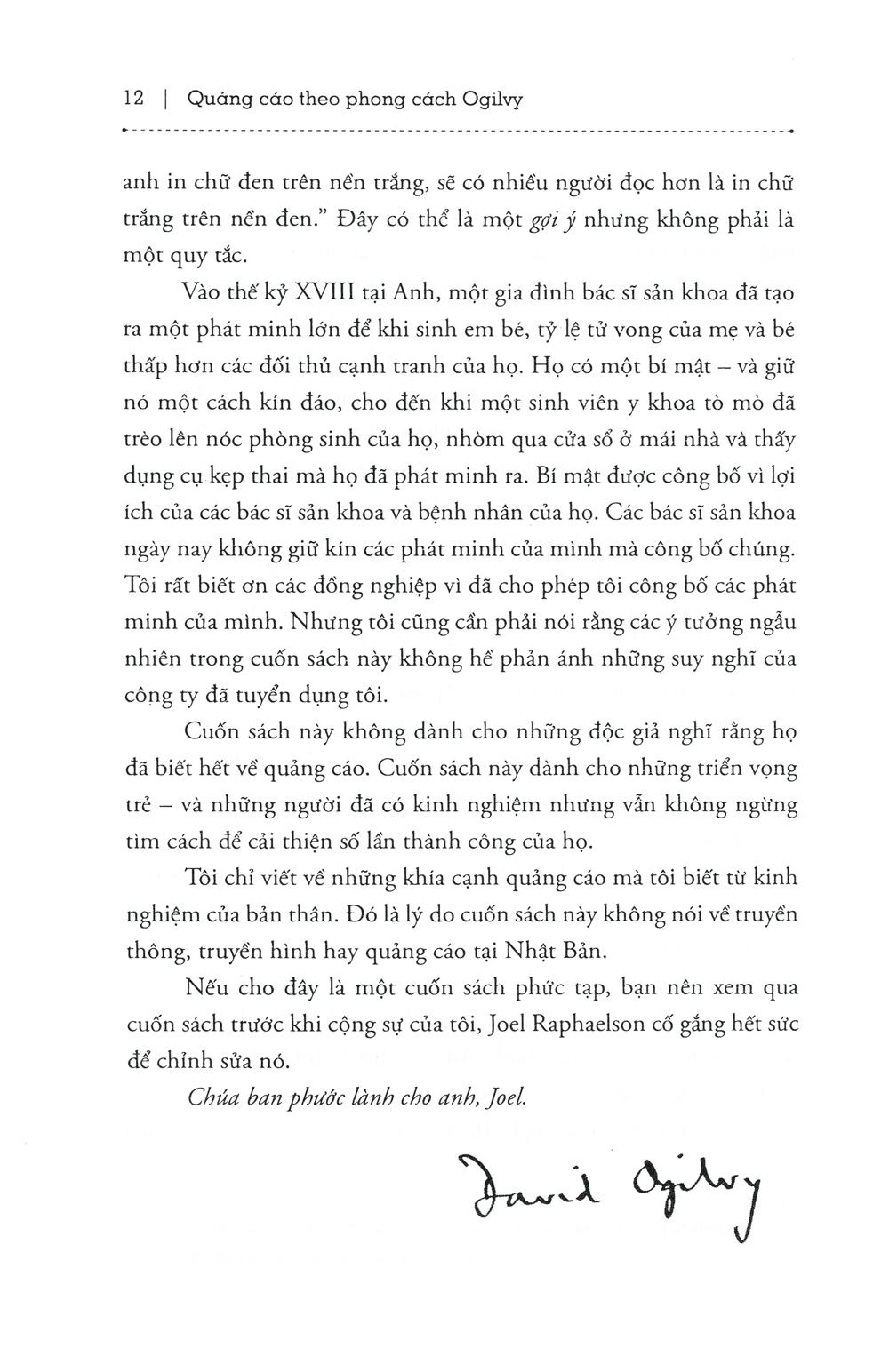 David Ogilvy là một trong những gương mặt nổi bật nhất của ngành quảng cáo, với danh xưng “Cha đẻ của nền quảng cáo hiện đại”. Các cuốn sách ông viết về nghệ thuật quảng cáo đều là những cuốn cẩm nang gối đầu giường của những người trong ngành, từ các vị giáo sư giảng dạy tại đại học đến những người thực sự lăn lộn tiếp xúc với khách hàng thường ngày. Họ gần như thuộc lòng những nguyên tắc và bí quyết của ông, đồng thời coi đó như kim chỉ nam trong nghề của m.ình.