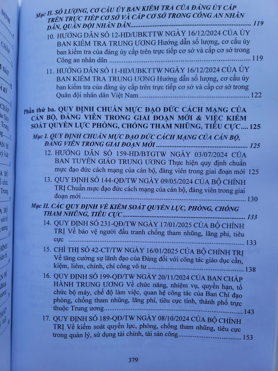 Thời gian qua, nhiều quy định, hướng dẫn của Ban Bí thư, Bộ Chính trị, Ban Chấp hành Trung ương cũng đã được ban hành như: Quy định số 231-QĐ/TW ngày 17/01/2025 Về bảo vệ người đấu tranh chống tham nhũng, lãng phí, tiêu cực, Quy định số 262-QĐ/TW ngày 03/02/2025 Về sửa đổi, bổ sung một số Điều của Quy định số 22-QĐ/TW, ngày 28/7/2021 của Ban Chấp hành Trung ương Đảng về công tác kiểm tra, giám sát và kỷ luật của Đảng…