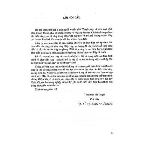 Chúng tôi biên soạn một cuốn sách Răng trẻ em tương đối toàn diện và cơ bản về một số vấn đề răng miệng của trẻ em dựa trên cơ sở cập nhật các kiến thức răng miệng hiện đại. Nhiều vấn đề chuyên sâu khác về Răng trẻ em còn chưa được đề cập đến ở đây. Mặc dù, nhóm biên soạn đã rất cố gắng nhưng cũng không thể tránh khỏi những khiếm khuyết và thiếu sót, chúng tôi rất mong nhận được sự góp ý của quý Thầy, Cô, các bạn đồng nghiệp và bạn đọc gần xa để cuốn sách được hoàn thiện hơn trong những lần xuất bản sau.