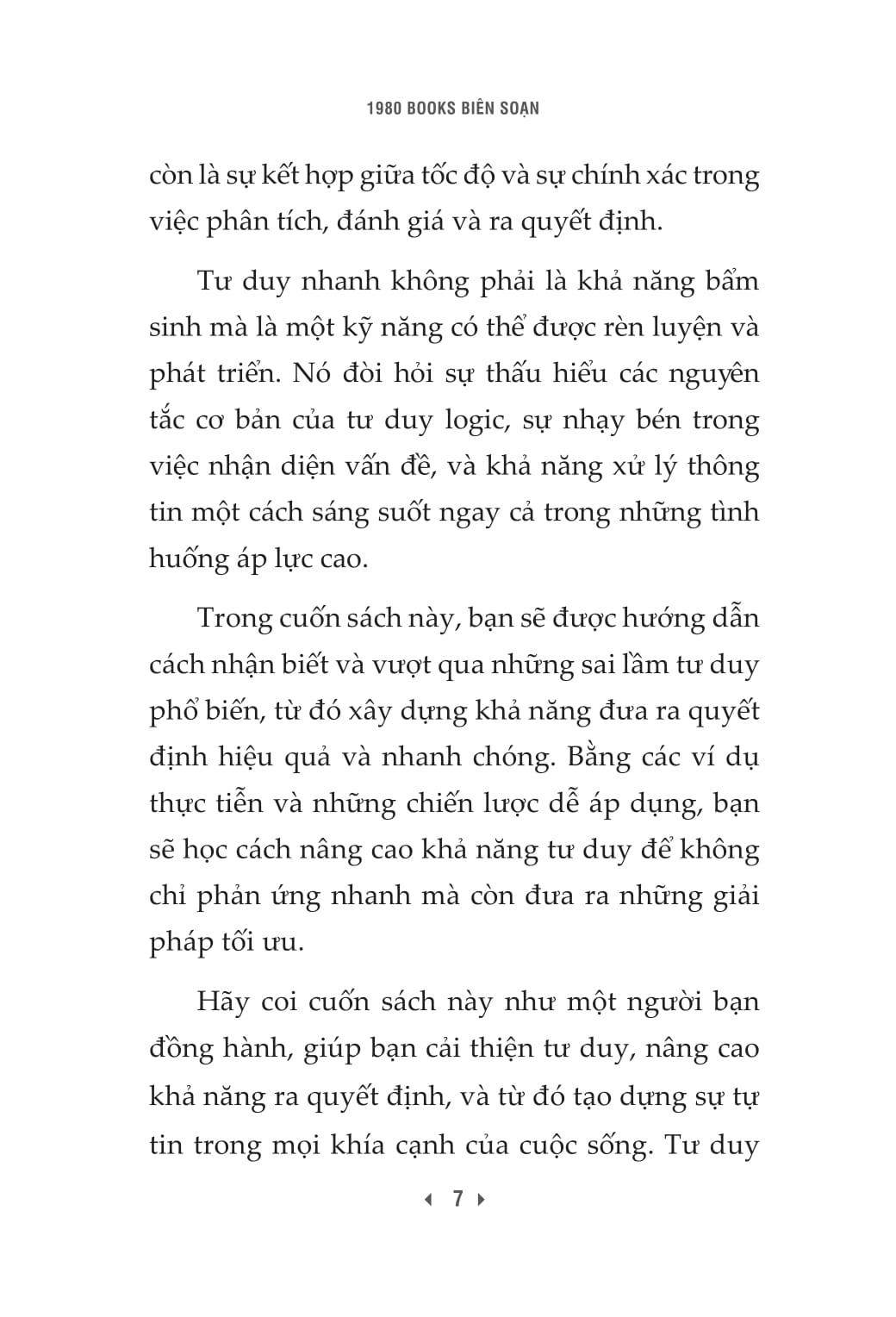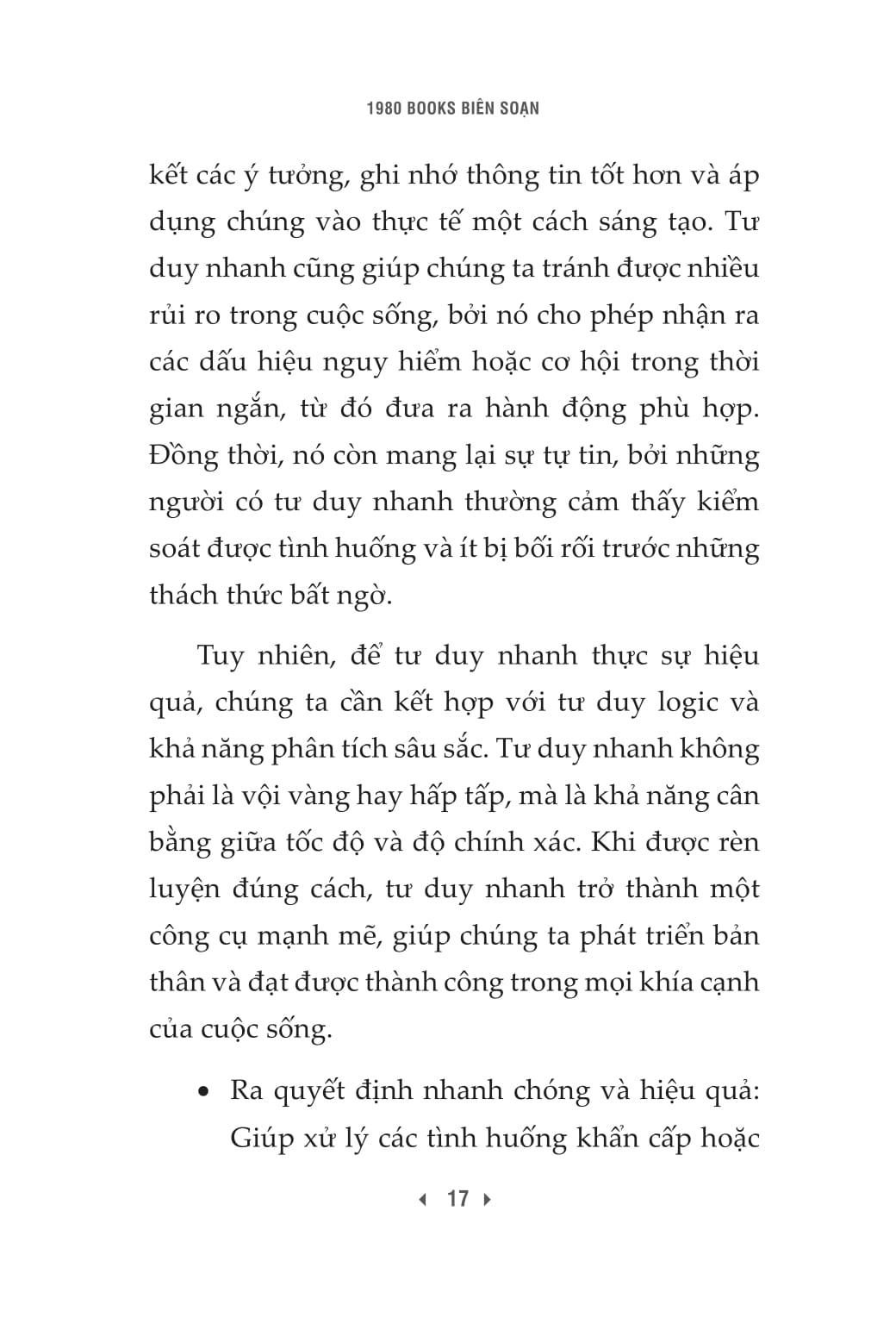 • Phần 3: Hướng dẫn ứng dụng tư duy nhanh vào các kỹ năng thiết yếu như quản lý thời gian, giao tiếp hiệu quả, ra quyết định. Đặc biệt, cuốn sách chỉ ra những sai lầm phổ biến trong tư duy nhanh, giúp người đọc không chỉ học "làm thế nào", mà còn biết "tránh điều gì".