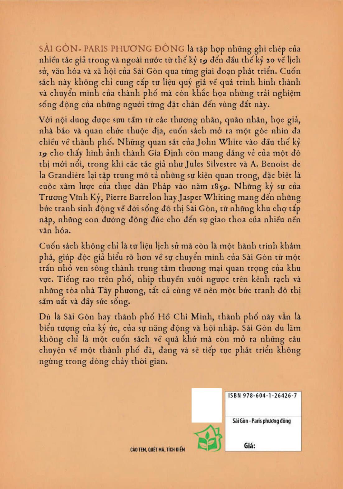 Sài Gòn - Paris Viễn Đông "Sài Gòn - Paris Viễn Đông" là tập hợp những ghi chép của nhiều tác giả trong và ngoài nước từ thế kỷ 19 đến đầu thế kỷ 20 về lịch sử, văn hóa và xã hội của Sài Gòn...