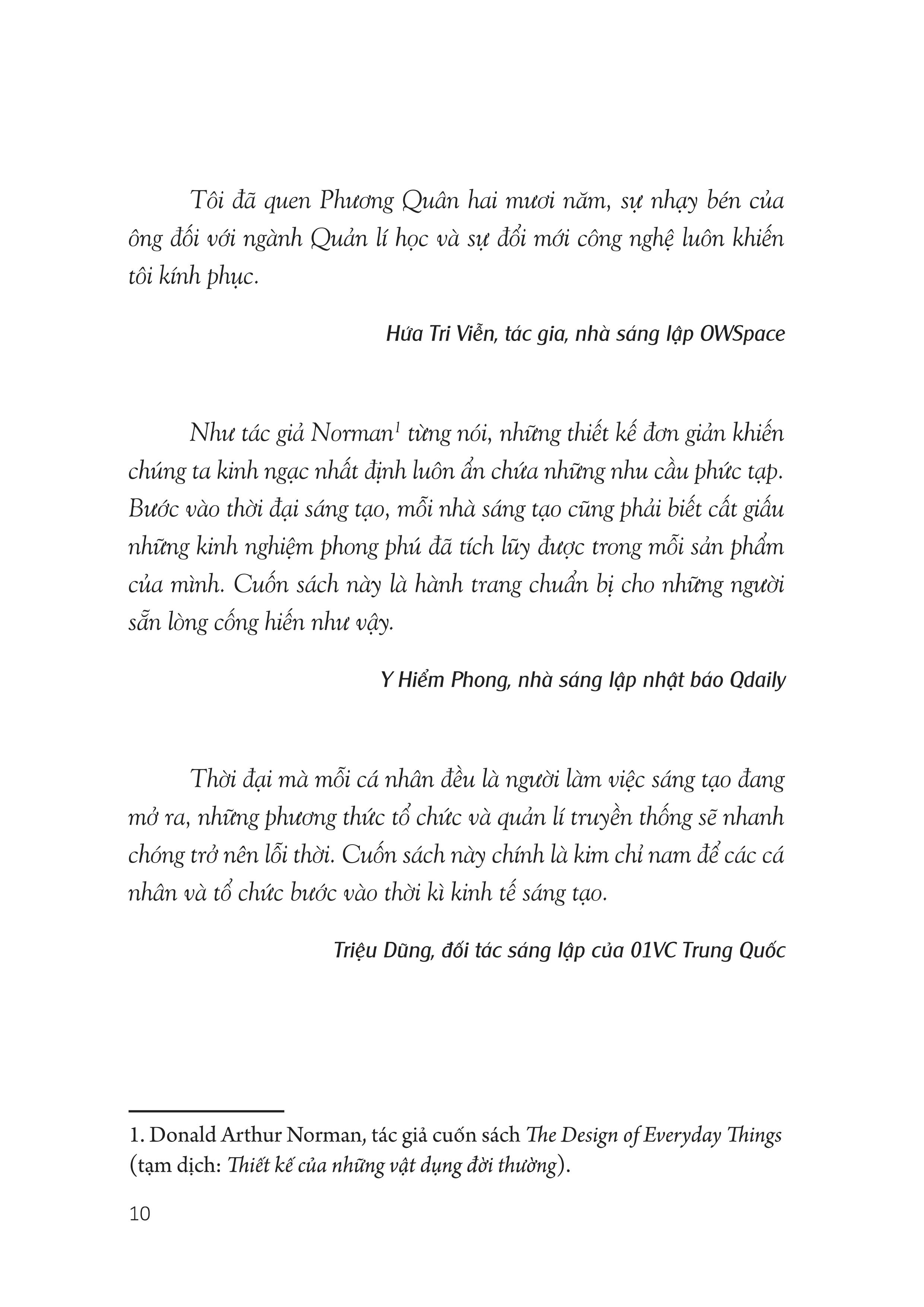 Đây là cuốn sách đầu tiên đưa ra đáp án hoàn chỉnh cho những câu hỏi này, đồng thời cung cấp nhiều cách lí giải độc đáo về các mặt như yếu tố quản lí sáng tạo, phương pháp luận, hệ thống và thiết kế sản phẩm, từ đó giúp chúng ta tìm hiểu về thời đại mới và cách thức để đạt được giá trị bền vững của con người.