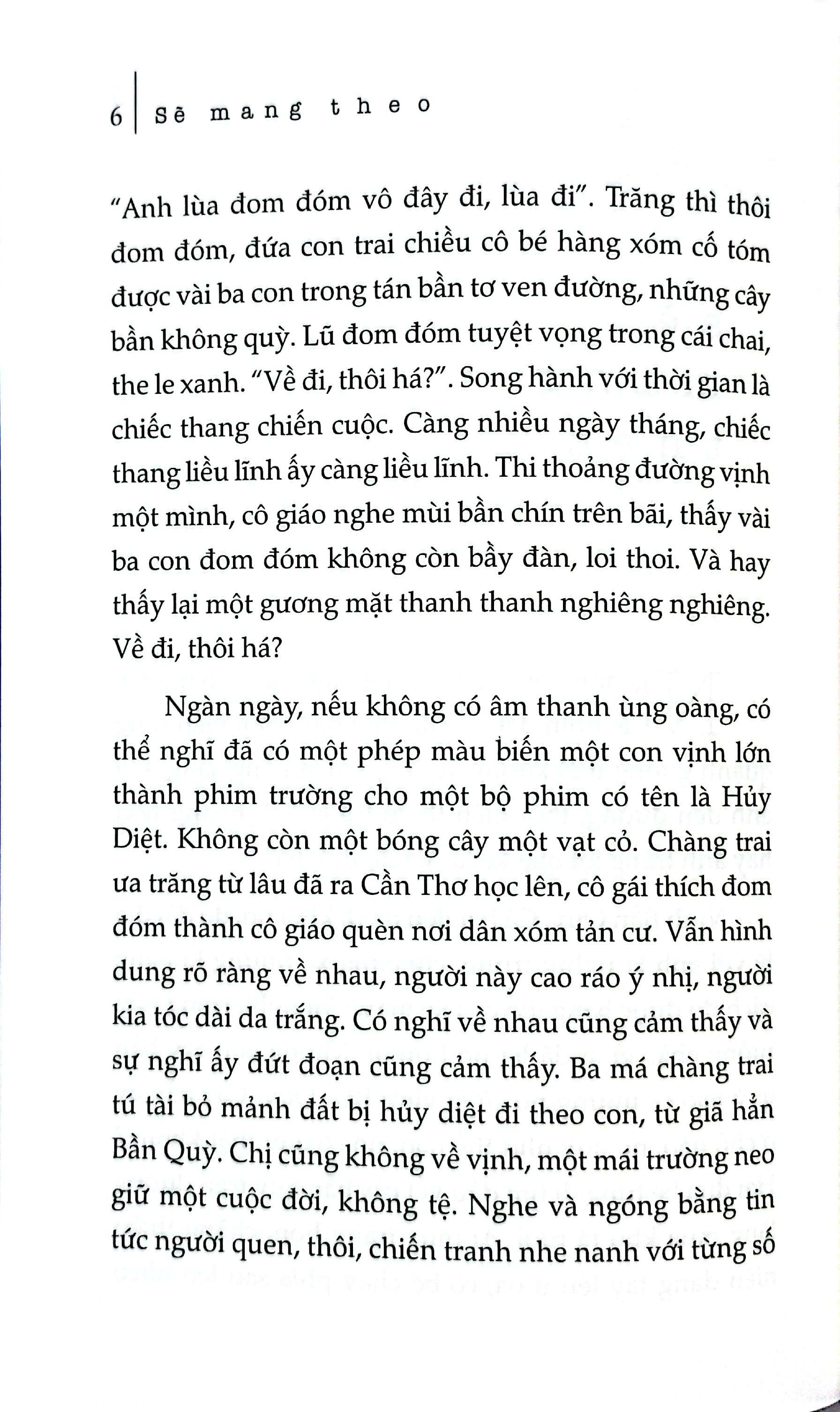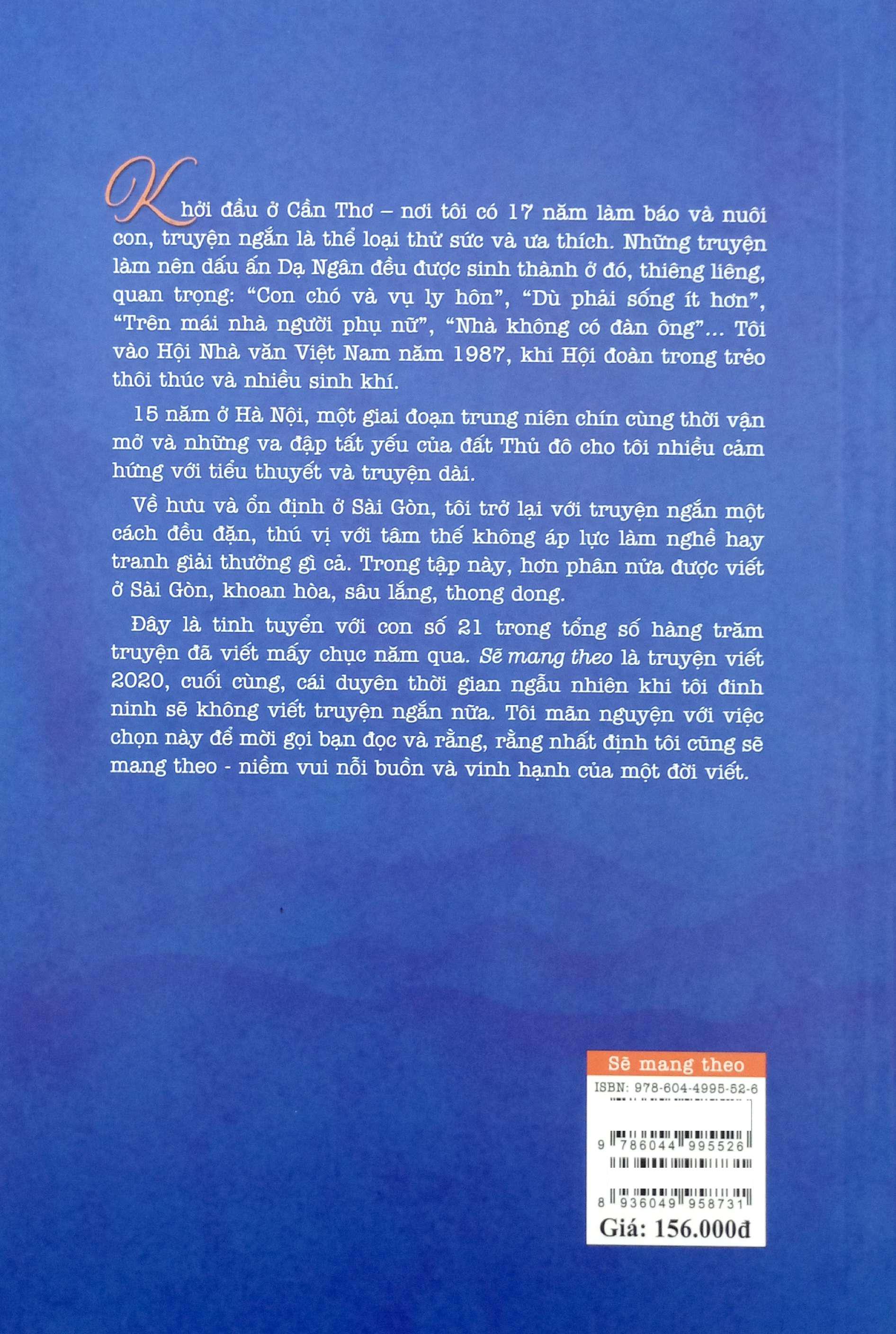 Đây là tinh tuyển với con số 21 trong tổng số hàng trăm truyện đã viết mấy chục năm qua. “Sẽ mang theo” là truyện viết 2020, cuối cùng, cái duyên thời gian ngẫu nhiên khi tôi đinh ninh sẽ không viết truyện ngắn nữa. Tôi mãn nguyện với việc chọn này và mời gọi bạn đọc và rằng, rằng nhất định tôi cũng sẽ mang theo – niềm vui nỗi buồn và vinh hạnh của một đời viết.” (Dạ Ngân)