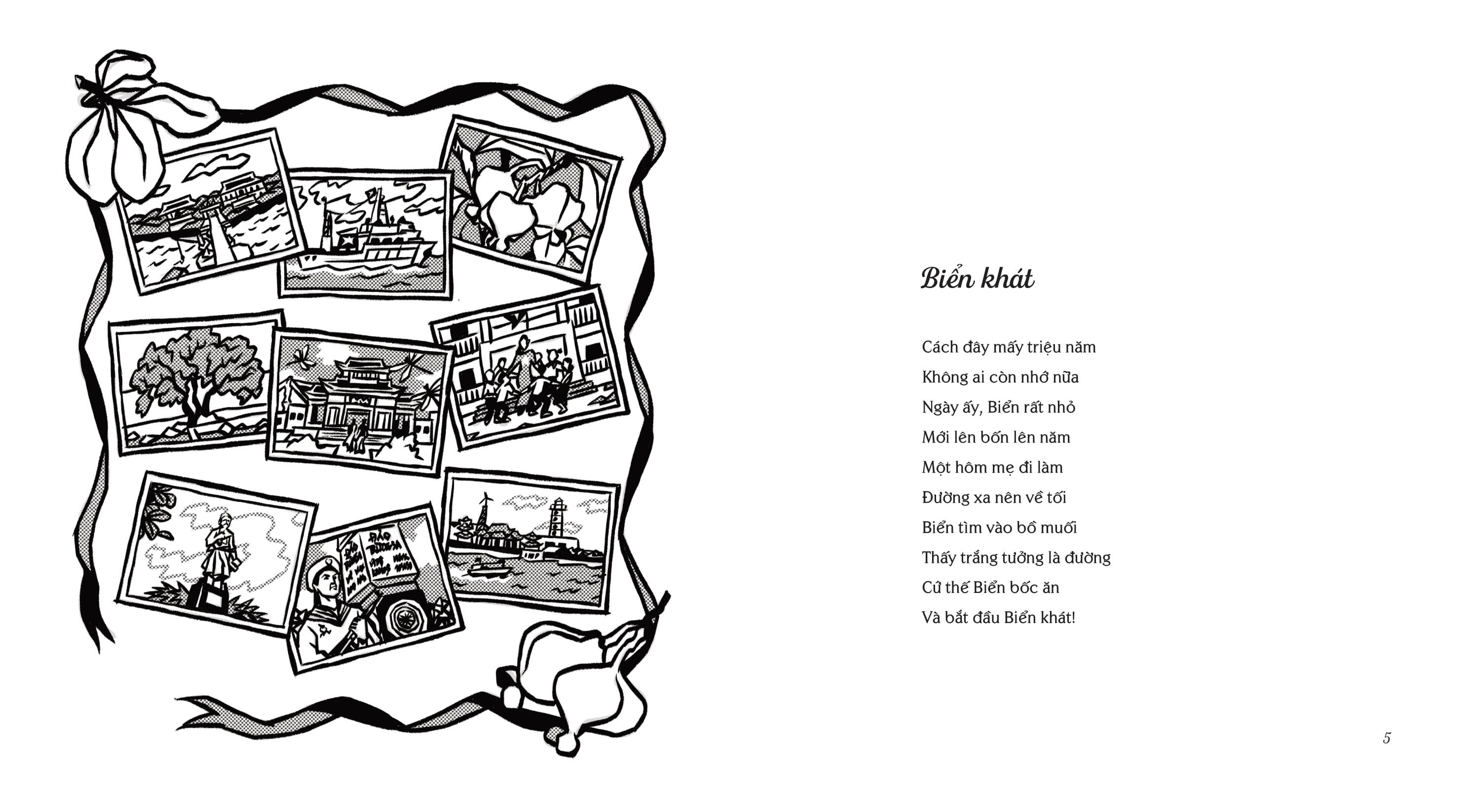 Có cậu bé biển nghịch ngợm, ăn vụng đường lại bốc nhầm muối, nên đã mấy triệu năm rồi vẫn khát; Có câu chuyện lịch sử về làng Đồng Cổ; Lại có anh dã tràng xây lâu đài cát khiến biển mê tít, cứ lượn quanh ngắm nghía mà “vỗ nghìn sóng hát”. Và có con sông mới sinh ra chỉ bé bằng sợi tóc, vượt qua bao rừng núi, bao thác ghềnh, qua mỗi nơi sông lại để lại những bến, làng, những con đê... để đến được biển thần tiên, sông đã vừa đi vừa lớn.