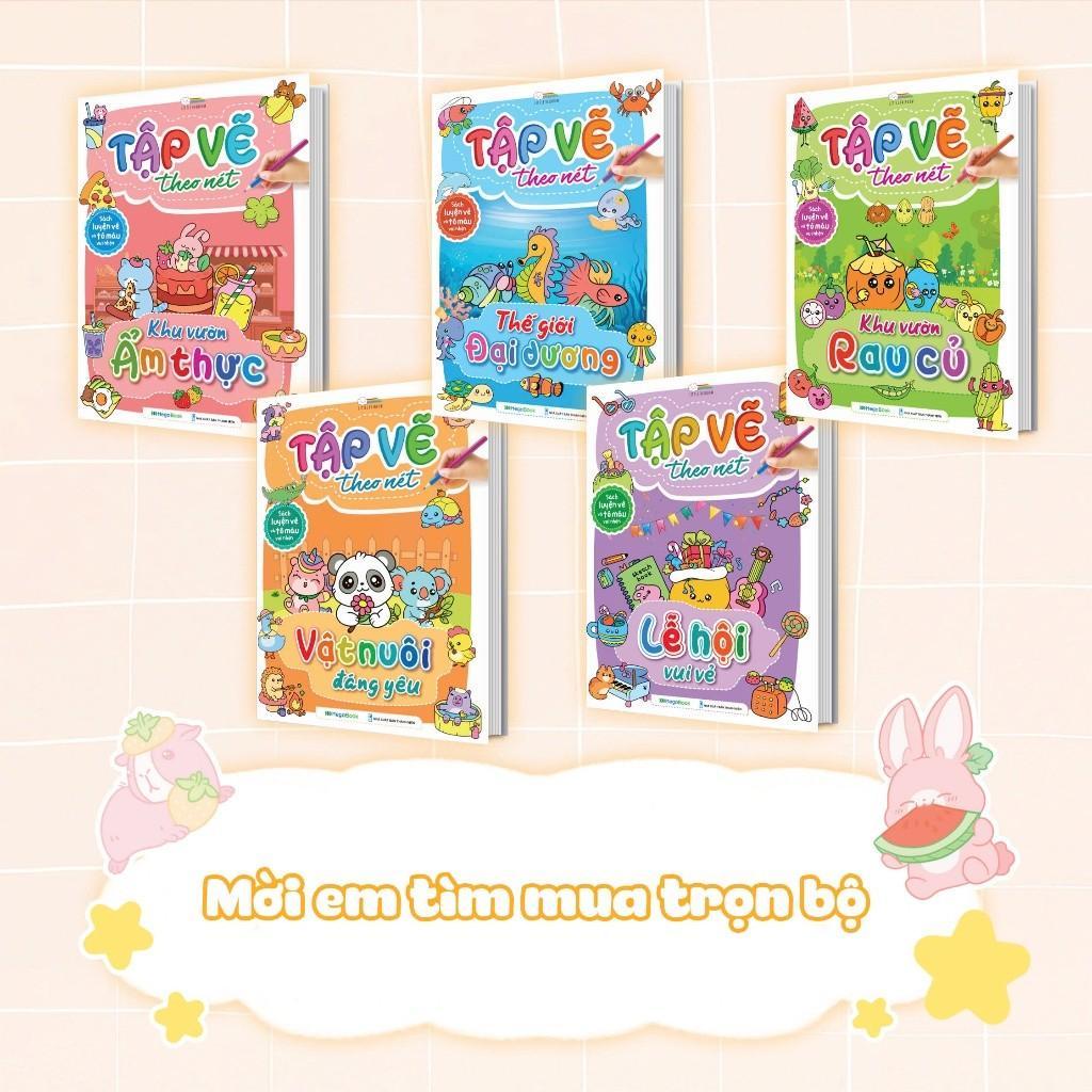Mua tại Tiktok"Tập vẽ theo nét" là bộ sách thú vị gồm 5 cuốn tập vẽ với các chủ đề hấp dẫn: Lễ hội vui vẻ, Khu vườn rau củ, Vật nuôi đáng yêu, Khu vườn ẩm thực, và Thế giới đại dương. Mỗi cuốn sách mở ra một thế giới sắc màu rực rỡ với các hình vẽ sinh động, giúp trẻ phát triển khả năng quan sát và tư duy sáng tạo, đồng thời giúp khơi dậy niềm đam mê, khả năng hội họa của các bé. Các hình vẽ đơn giản, dễ thương, dễ thực hiện, giúp trẻ rèn luyện kỹ năng cầm bút, quan sát chi tiết và thể hiện sự sáng tạo theo cách riêng của mình. Ưu điểm của bộ sách "Tập Vẽ Theo Nét"