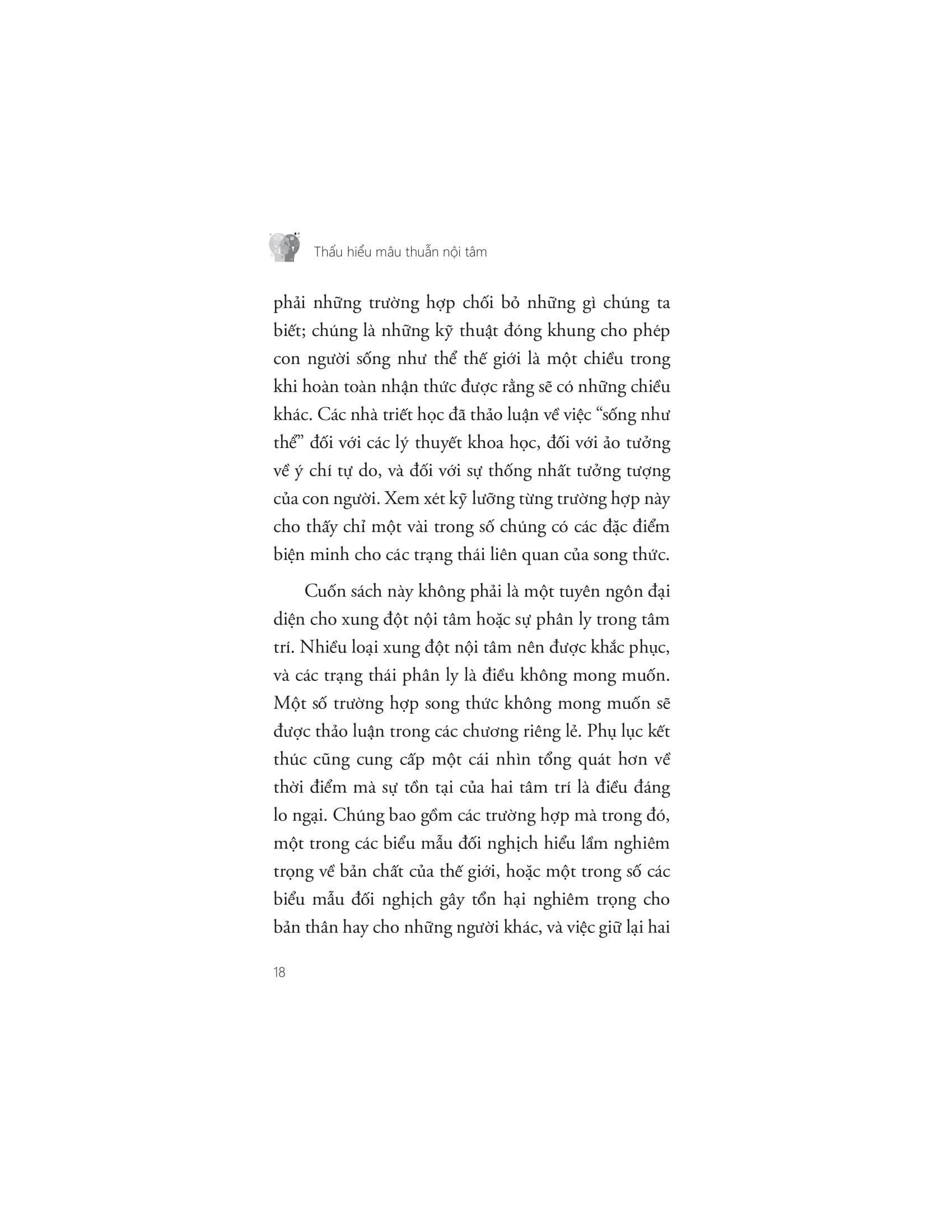 Tuy nhiên, trong cuốn sách “Thấu hiểu mâu thuẫn nội tâm” – tác giả Jennifer Church lập luận: Mâu thuẫn nội tâm có thể là một điều tốt, giúp chúng ta tự phản ánh và hiểu rõ hơn về bản thân, giá trị và niềm tin của m.ình. Cuốn sách này mô tả một vài kiểu mẫu của “song thức” hay “ý chí kép” và giải thích làm thế nào để trạng thái này được duy trì.