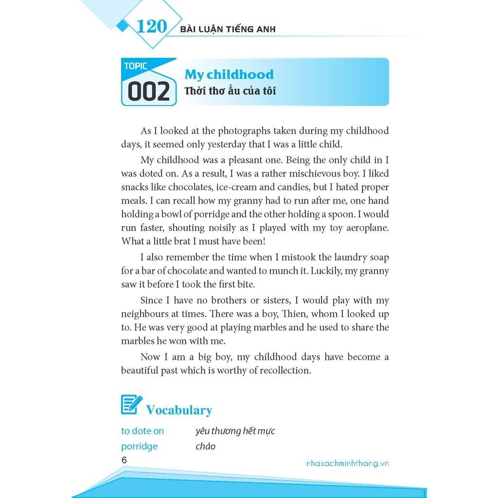 • Cuốn sách " 120 bài luận tiếng Anh" được biên soạn với hy vọng giúp các bạn học sinh, sinh viên trong quá trình suy luận, diễn giải vấn đề một cách logic và sử dụng vốn từ, kiến thức ngữ pháp để viết đúng, viết hay theo chủ đề định sẵn.