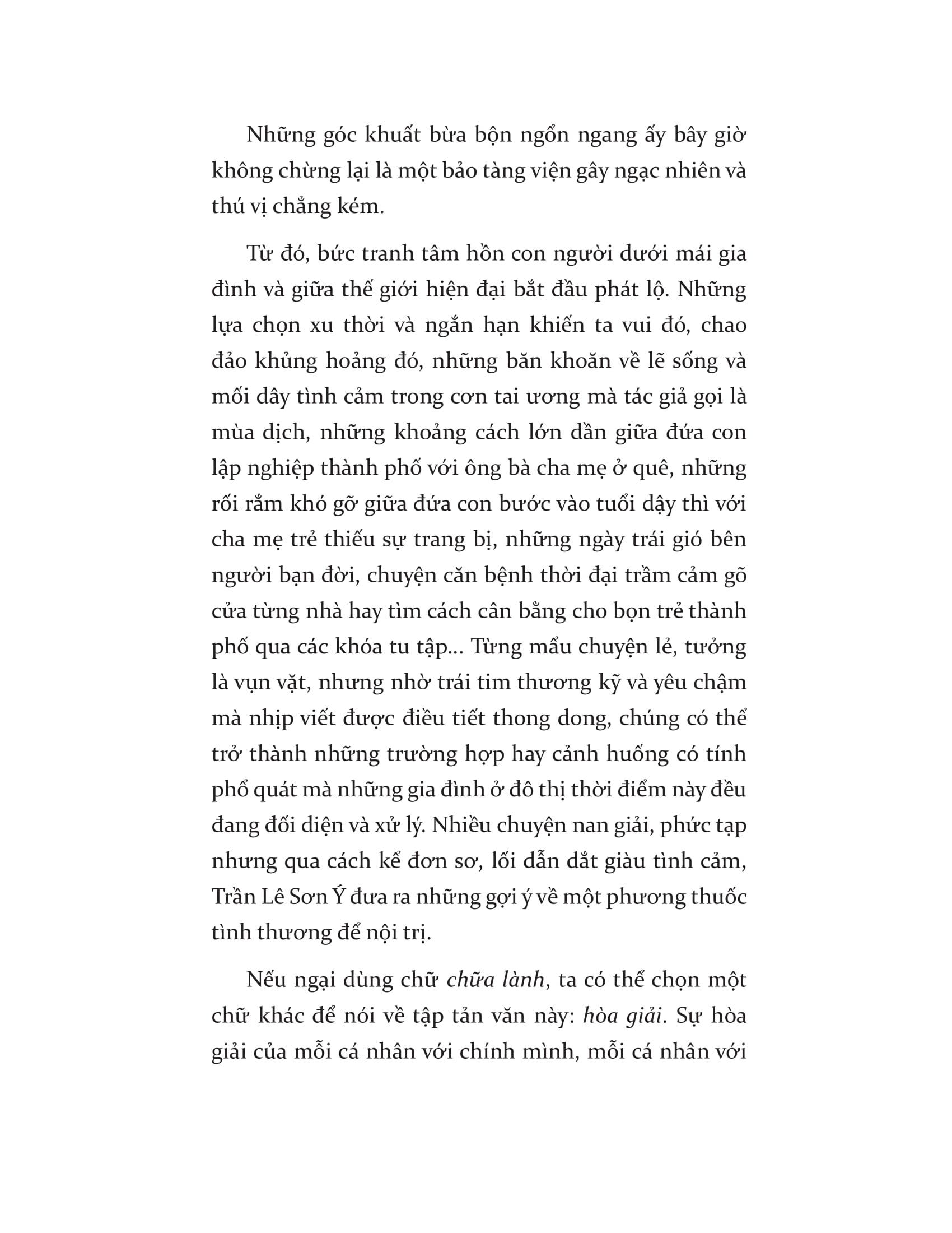 Nếu ngại dùng chữ chữa lành, ta có thể chọn một chữ khác để nói về tập tản văn này: hòa giải. Sự hòa giải của mỗi cá nhân với chính m.ình, mỗi cá nhân với những tương quan trong mái ấm và với xã hội, thiên nhiên rộng lớn.