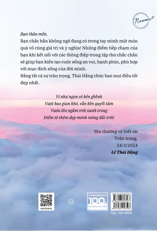 Thông tin tác giả: Nhà thơ Thái Hằng tên gọi đầy đủ là Lê Thái Hằng, sinh năm 1970, hiện đang sinh sống và làm việc tại Canada. Sau bao năm trăn trở ý nghĩa thực sự của kiếp nhân sinh qua những trải nghiệm thăng trầm buồn vui của đời mình, năm 2020 nhân duyên đặc biệt đến, nhà thơ có trải nghiệm thức tỉnh tâm linh và dần giải đáp được những trăn trở trong tâm mình. Khả năng