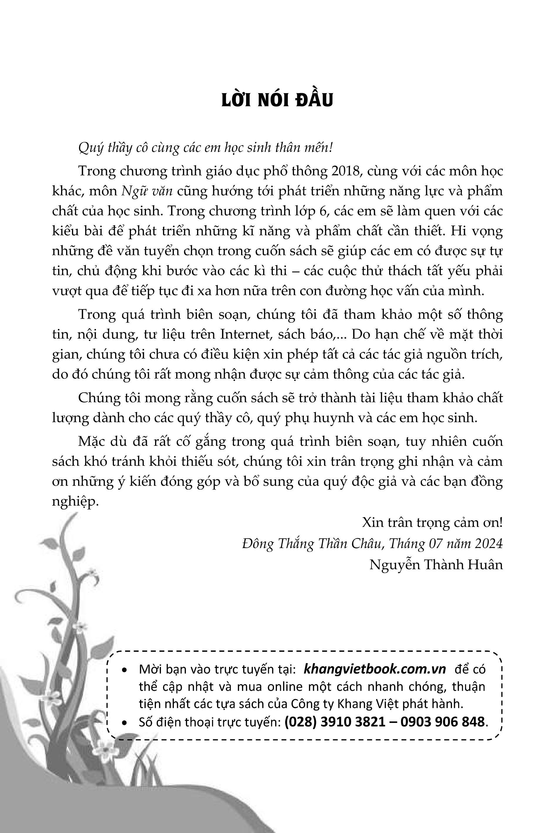 Trong chương trình giáo dục phổ thông 2018, cùng với các môn học khác, môn Ngữ văn cũng hướng tới phát triển những năng lực và phẩm chất của học sinh. Trong chương trình lớp 6, các em sẽ làm quen với các kiểu bài để phát triển những kĩ năng và phẩm chất cần thiết. Hi vọng những đề văn tuyển chọn trong cuốn sách sẽ giúp các em có được sự tự tin, chủ động khi bước vào các kì thi – các cuộc thử thách tất yếu phải vượt qua để tiếp tục đi xa hơn nữa trên con đường học vấn của m.ình.
