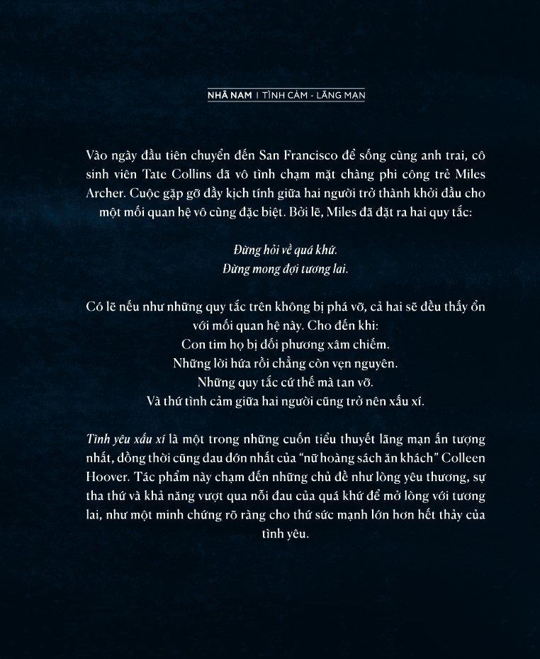 Tình yêu xấu xí là một trong những cuốn tiểu thuyết lãng mạn ẩn tượng nhất, đồng thời cũng đau đờn nhất của "nữ hoàng sách ăn khách" Colleen Hoover. Tác phẩm này chạm đến những chủ đề như lòng yêu thương, sự tha thứ và khả năng vượt qua nỗi đau của quá khứ để mở lòng với tương - lai, như một minh chứng rõ râng cho thứ sức mạnh lớn hơn hết thảy của tinh yeu.