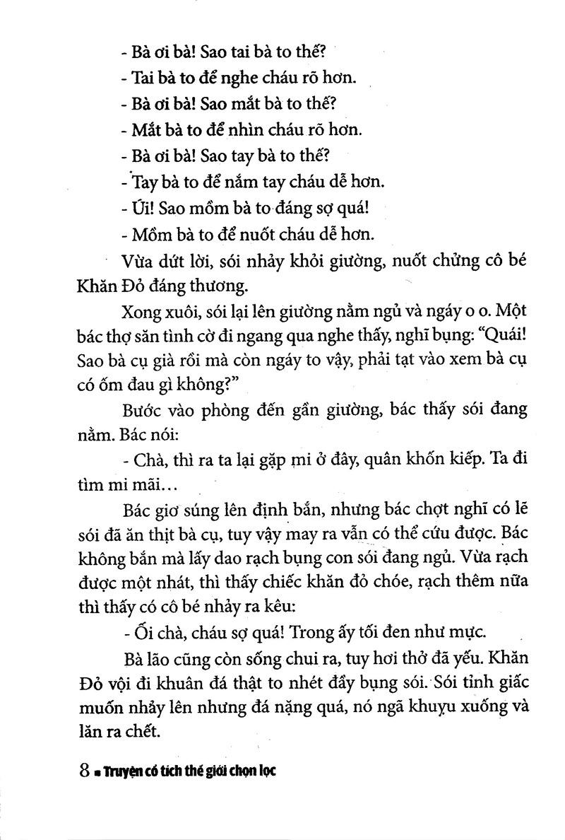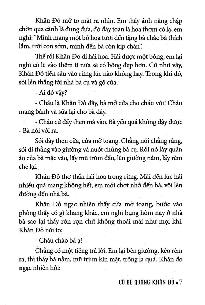 Truyện Cổ Tích Thế Giới Chọn Lọc - Cô Bé Quàng Khăn Đỏ kể về ngày xửa ngày xưa, có một cô bé rất là ngoan ngoãn ai cũng yêu mến nhất là bà, bà tặng cho cô bé một chiếc khăn màu đỏ. Cô bé thích lắm ngày nào cũng quàng chiếc khăn, nên mọi người thường gọi cô là "cô bé quàng khăn đỏ". Một hôm, bà Khăn Đỏ bị ốm, mẹ dặn Khăn Đỏ mang bánh và trái cây đến cho bà. Nhưng Khăn Đỏ lại có tính ham chơi nên đã quên bẵng đi lời mẹ dặn không đi thẳng mà lại đi đường vòng...
