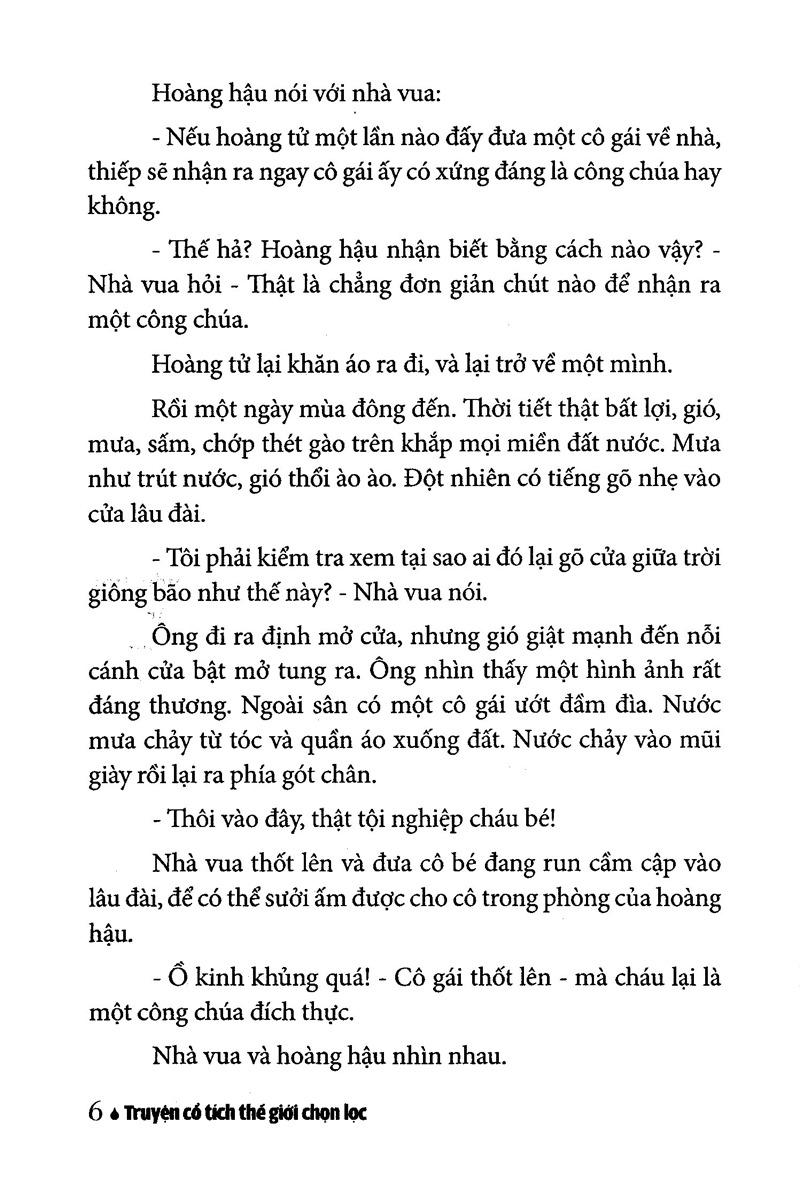 Truyện Cổ Tích Thế Giới Chọn Lọc - Công Chúa Và Hạt Đậu kể về ngày xửa ngày xưa, ở vương quốc nọ, có một hoàng tử muốn cưới vợ nhưng người vợ ấy phải hoàn thiện toàn mỹ. Hoàng tử bèn chu du khắp thiên hạ để kén vợ. Công chúa thì chẳng thiếu gì, nhưng nàng nào cũng có vài nhược điểm hoặc tật xấu. Thế là một ngày kia, hoàng tử đành buồn rầu trở về nhà. Đến tối, nổi lên một cơn giông tố kinh khủng. Mưa ào ào như xối. Có tiếng gõ cửa lâu đài. Lão vương thân chinh ra mở cửa...