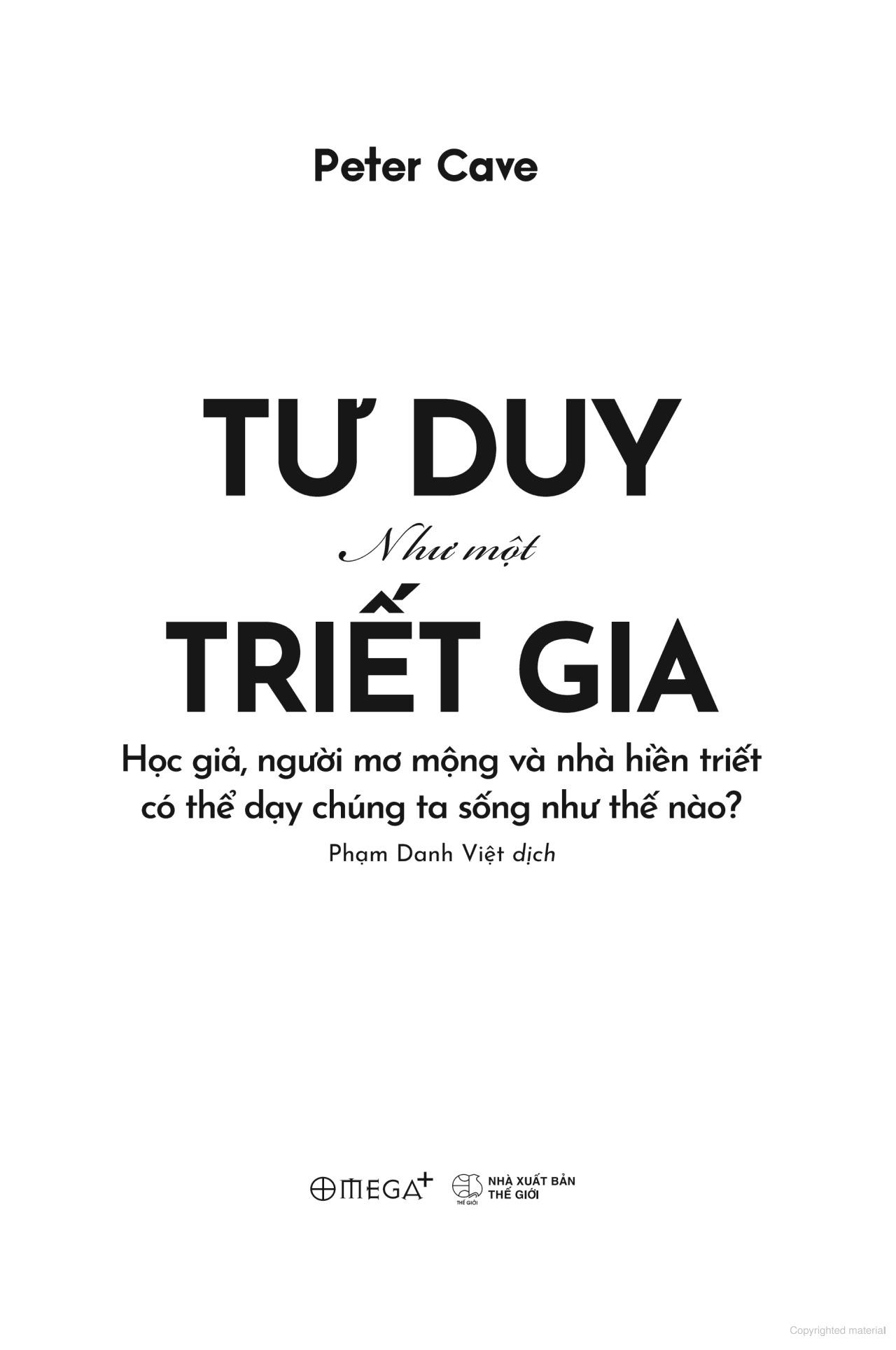“Tư duy như một triết gia” là một cuốn sách vừa mang tính triết học nhưng cũng rất gần gũi với đời sống thường ngày của chúng ta. Trong mỗi chương của cuốn sách, Peter Cave đã tập trung vào một triết gia, bằng cách giới thiệu ngắn gọn về cuộc đời, bối cảnh lịch sử và những tư tưởng quan trọng nhất của 30 triết gia nổi tiếng từ phương Đông đến phương Tây, bao gồm những cái tên quen thuộc như Socrates, Nietzsche, Simone de Beauvoir và Lão Tử.