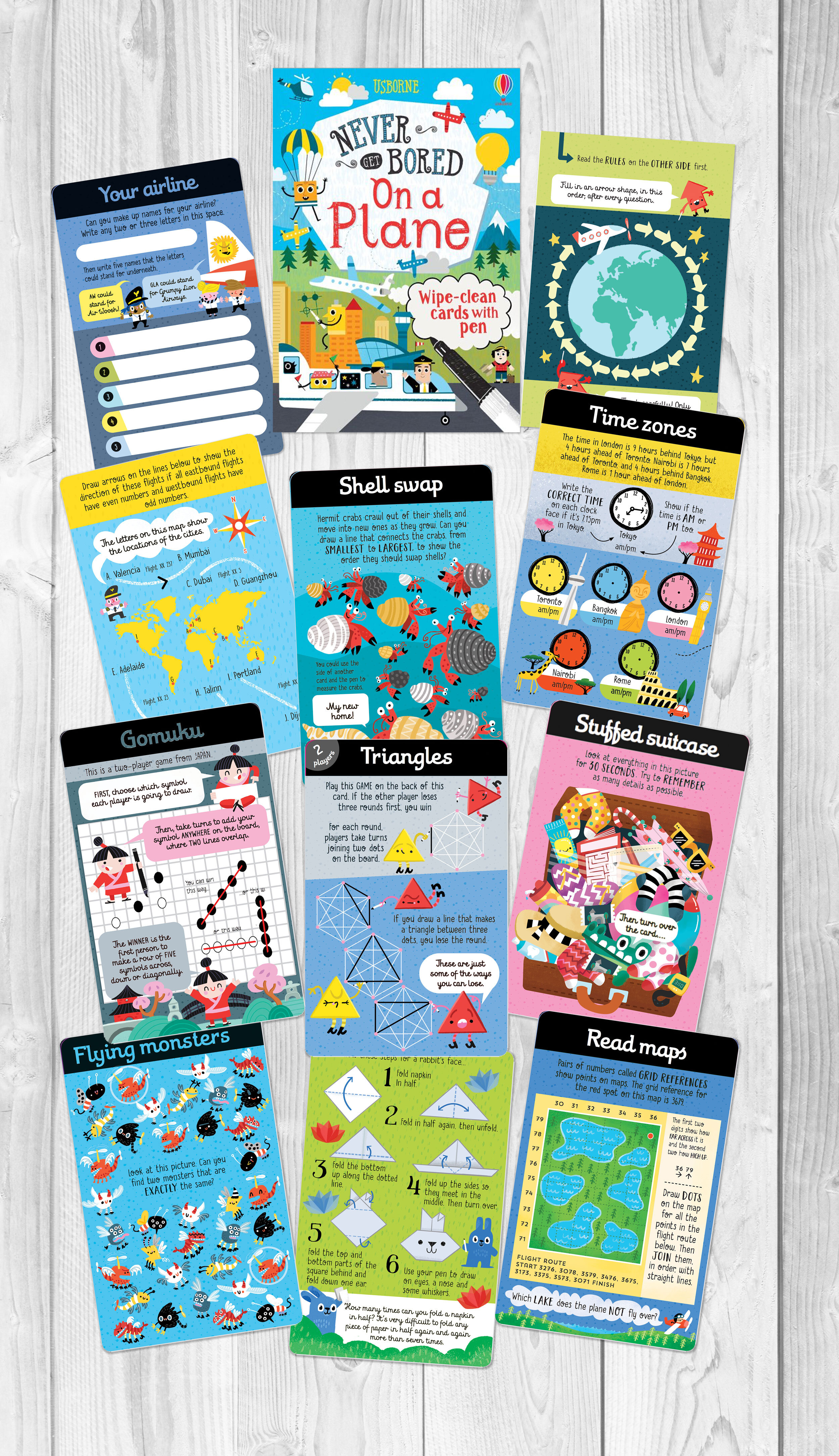Jet off and leave boredom behind with this pack of 50 wipe-clean cards, jam-packed with puzzles and activities including memory tests, guessing games, dot-to-dots and codebreakers. Perfect for holidays and long journeys, the pack contains one-player puzzles and exciting games for lots of players. The cards are wipe-clean and come with a pen, so each game can be enjoyed again and again.