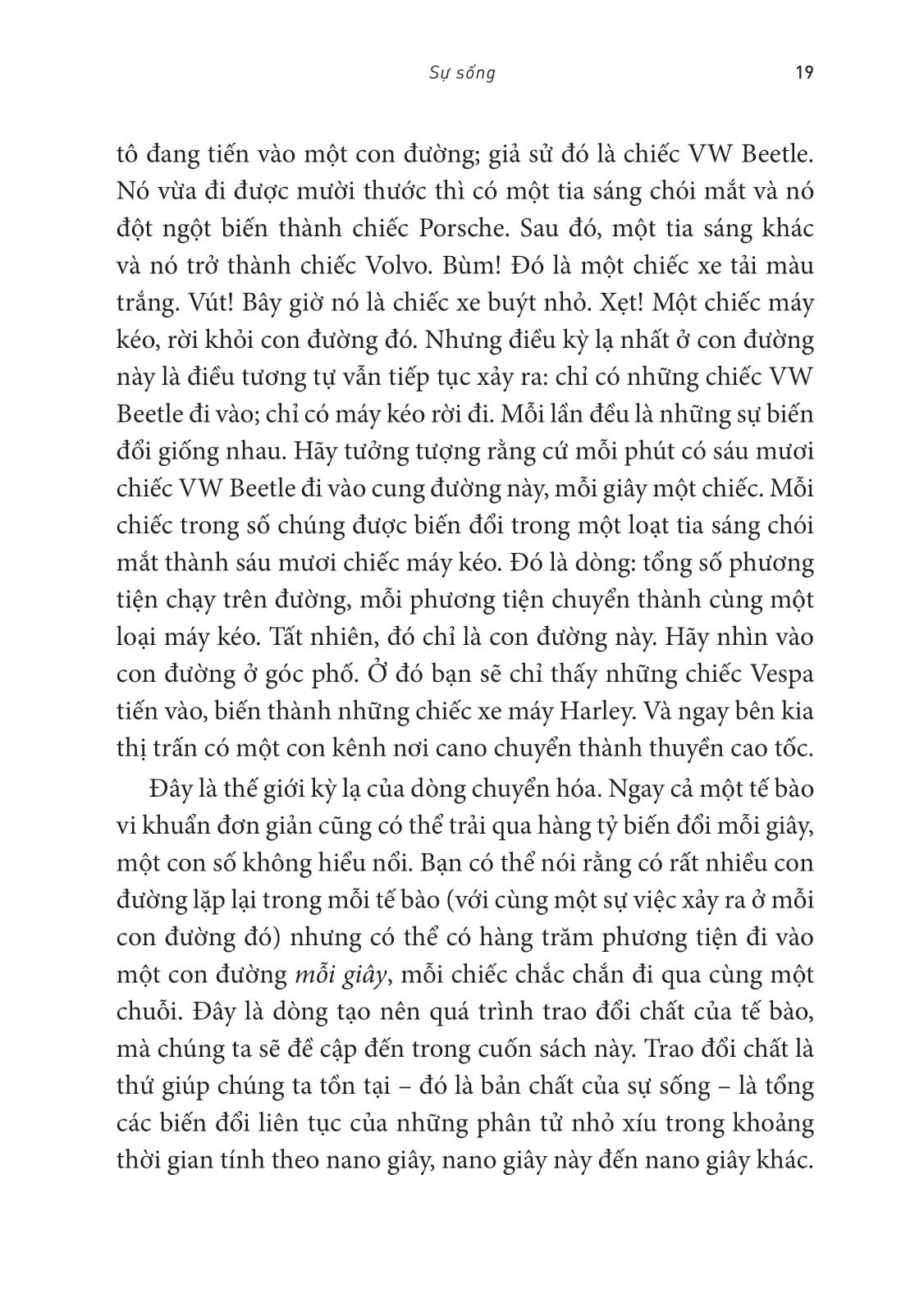 Nhiều thập kỷ trôi qua, hướng nghiên cứu chính trong ngành sinh học chủ yếu đến từ nghiên cứu thông tin di truyền. Dù cho thông tin di truyền là một yếu tố quan trọng, nhưng nó chỉ là một phần tạo nên sự sống của con người, không phải là tất cả. Con người chúng ta sở hữu mạng lưới trao đổi chất được truyền từ thế hệ này sang thế hệ khác, giúp chúng ta liên tục duy trì sự sống. Trong Vũ điệu sự sống, Nick Lane sẽ giải mã làm thế nào “dòng năng lượng và vật chất đã tạo nên quá trình tiến hóa sự sống và thậm chí cả thông tin di truyền” thông qua chu trình Krebs – chu trình trung tâm của quá trình trao đổi chất, là cội nguồn của sự sống và diệt vong. Chu trình Krebs cung cấp nhiều viên gạch cơ bản để tạo thành cấu trúc của tế bào. Tuy nhiên, cũng chính chu trình này, các nguyên tử tách ra khỏi chu trình do xảy ra quá trình oxy hóa. Vũ điệu sự sống kết hợp các sự kiện về hành tinh cùng với câu chuyện diễn ra xung quanh tế bào của chúng ta - điều gì tạo nên con người và cách nó liên hệ giữa con người với nguồn gốc của sự sống. Cuộc sống về cơ bản là một hiện tượng hóa học: Đây là logic sâu sắc của nó.