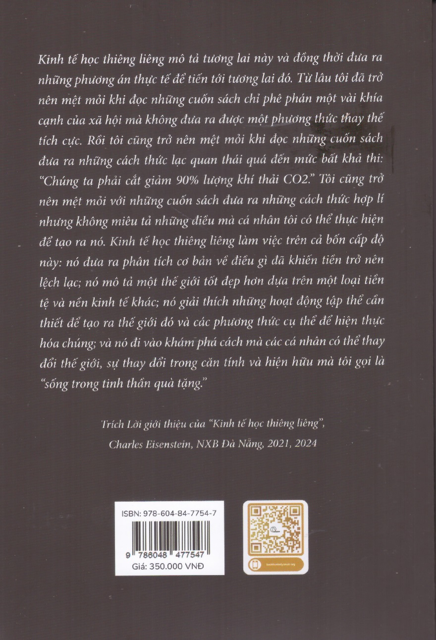 Tác giả Charles Eisenstein cũng xem xét các khó khăn mà những cá nhân quân tâm đến “sinh kế đúng đắn” và lối sống bền vững trong một thế giới dường như bị tiền bạc cai trị. Đồng thời ông cũng đưa ra gợi ý về cách triển khai mô hình “Kinh tế học thiêng liêng” trên thực tế.